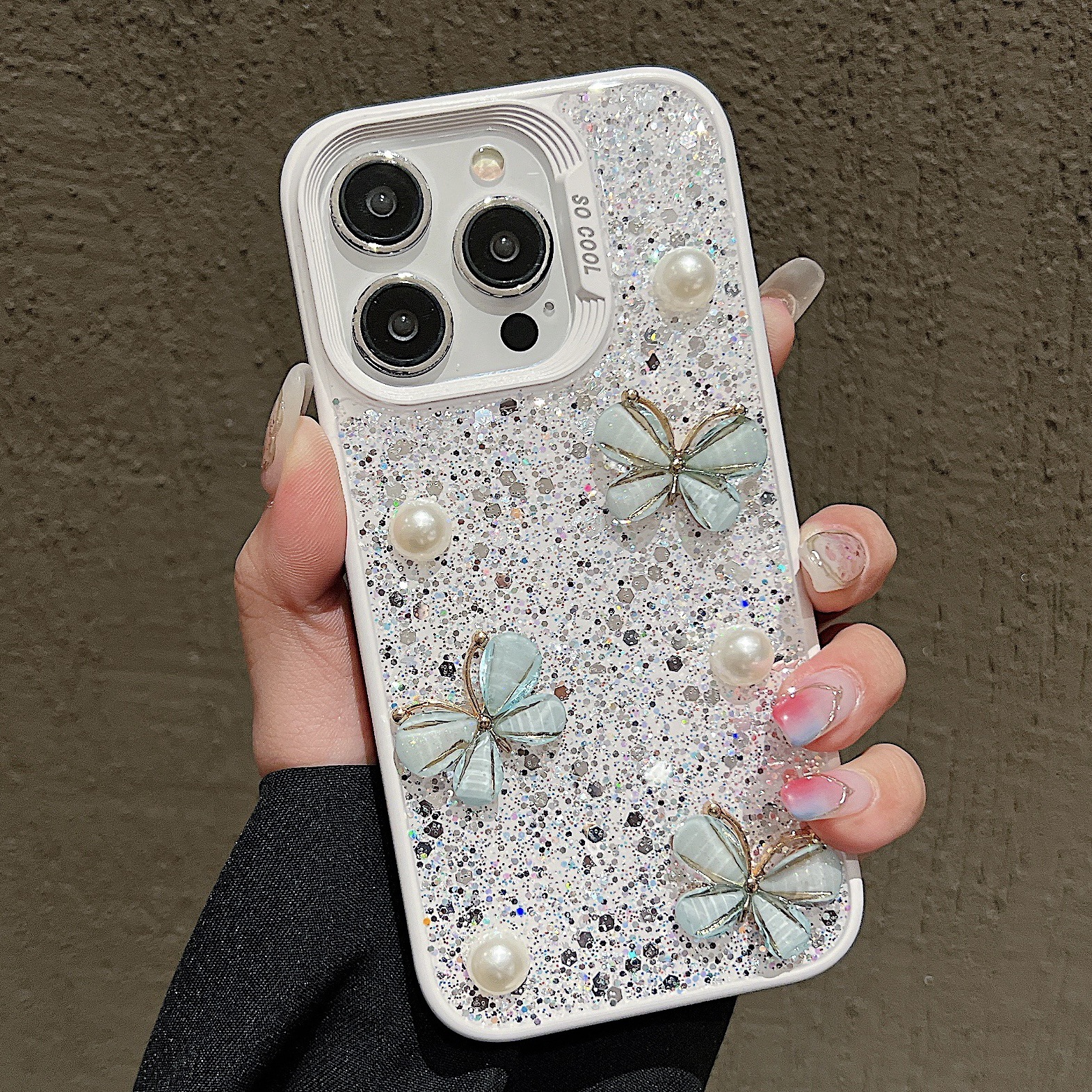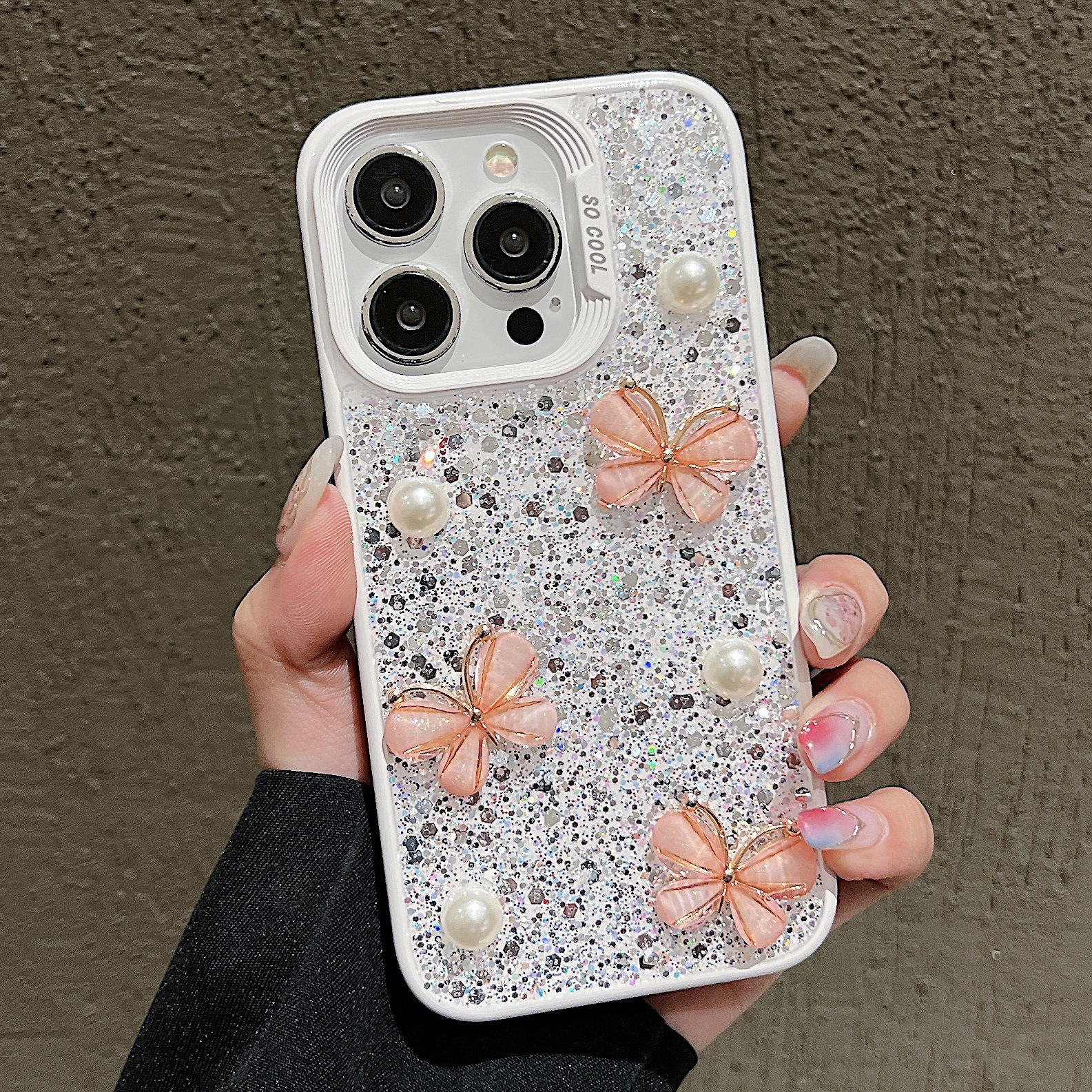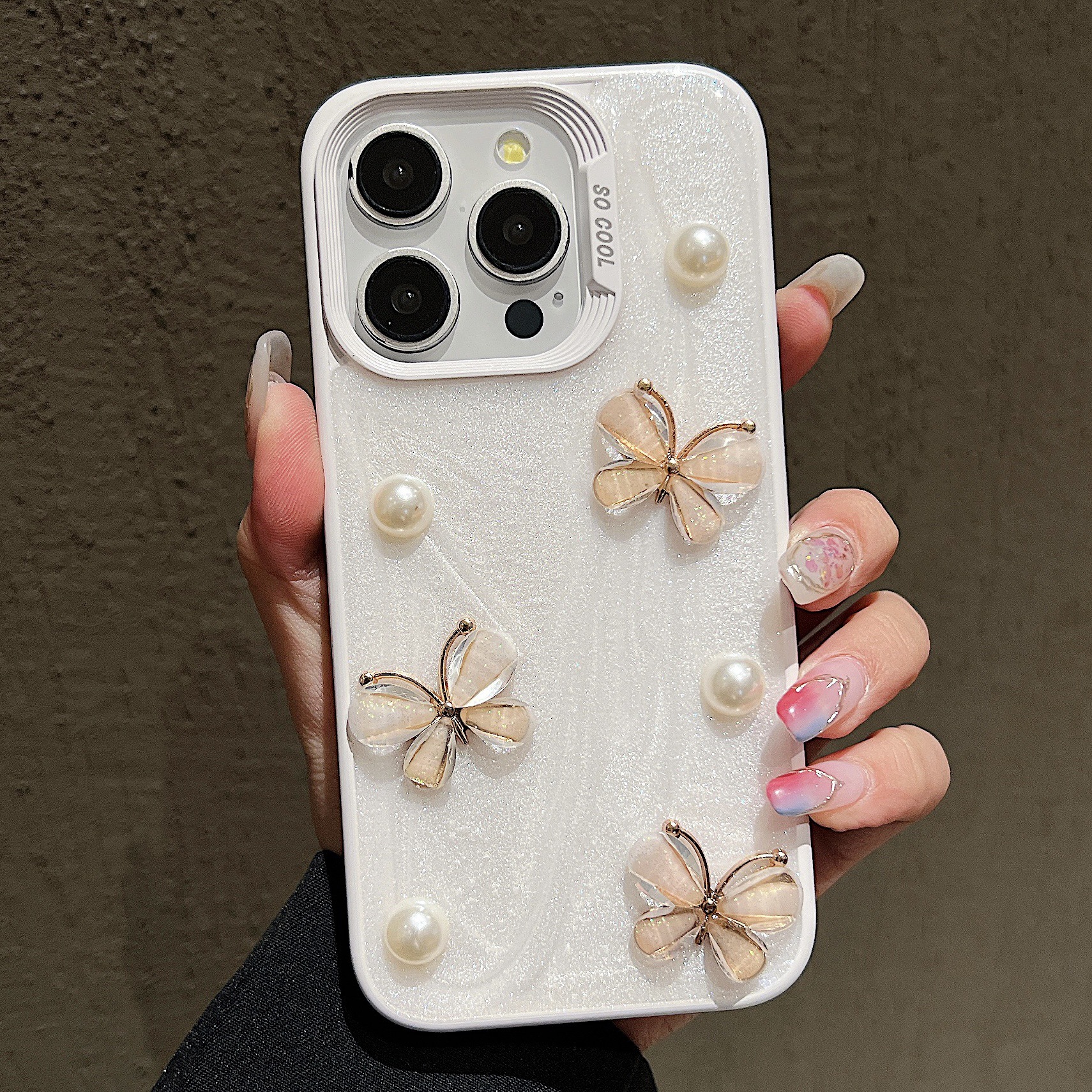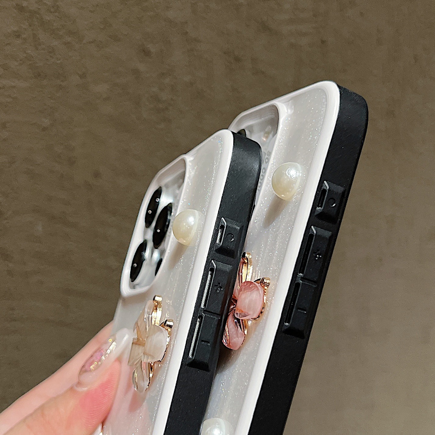 立体滴胶珍珠蝴蝶适用15Promax手机壳14pro苹果13防摔12/11水泥白