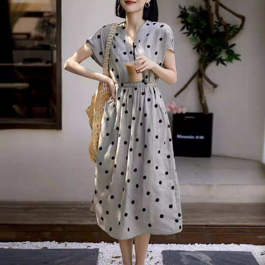 斑驳艺术复古刺绣波点 轻盈感小众设计夏季女高级质感亚麻连衣裙