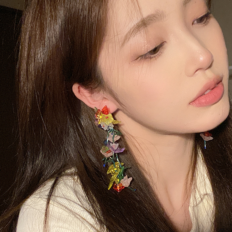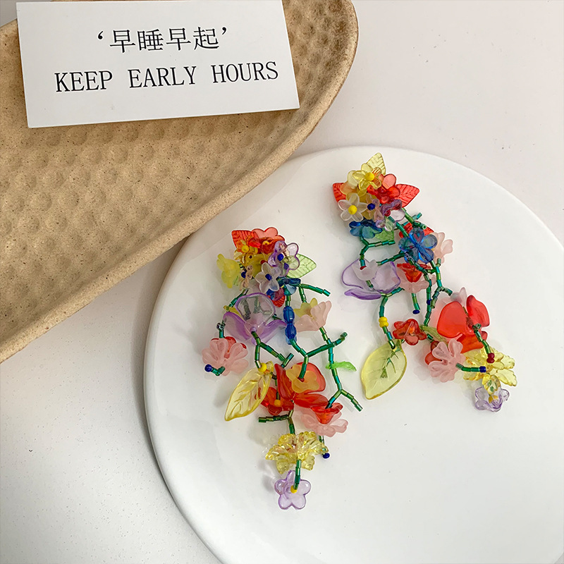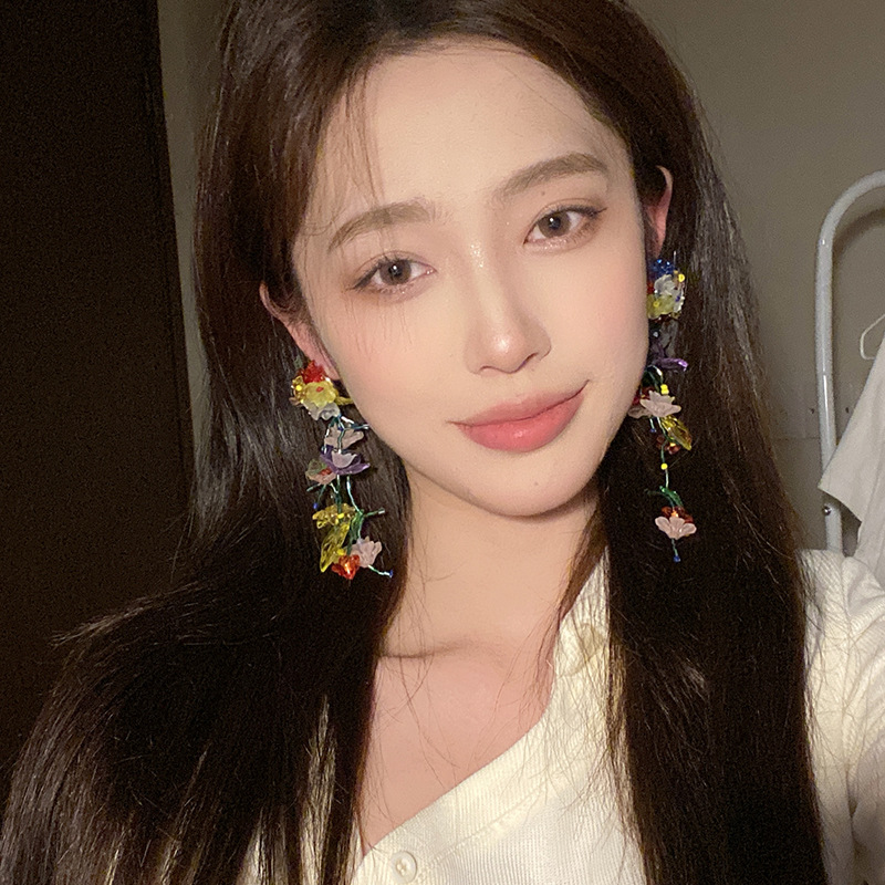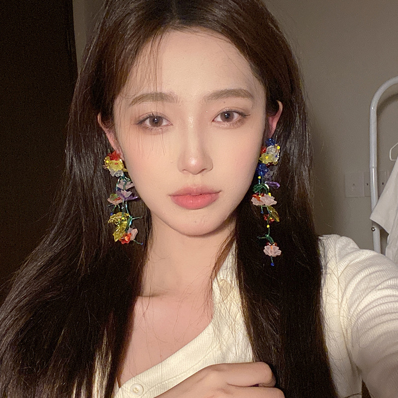 个性设计感彩色繁花手工编织耳钉女春夏串珠花朵叶子耳坠长款耳环