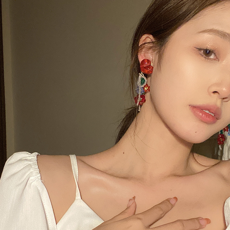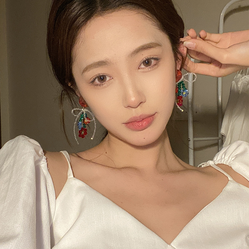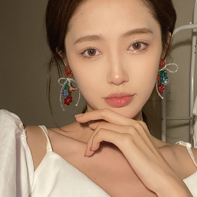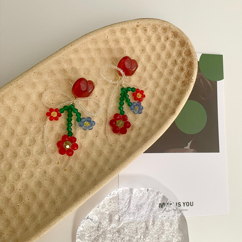 红色爱心花朵串珠耳环春夏彩色水晶甜美蝴蝶结耳坠个性气质耳饰品