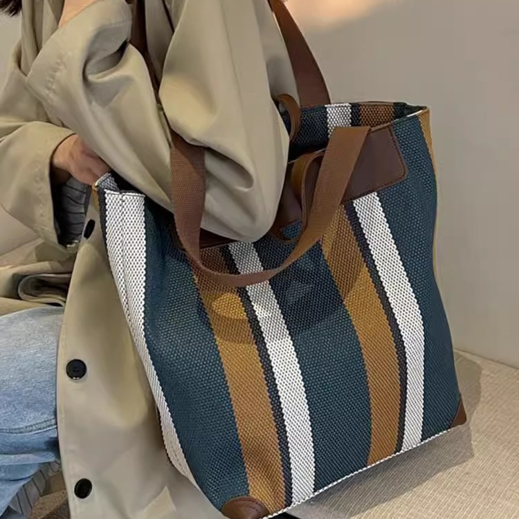 夏日字母蓝白条纹帆布包休闲慵懒风大容量单肩斜挎腋下包