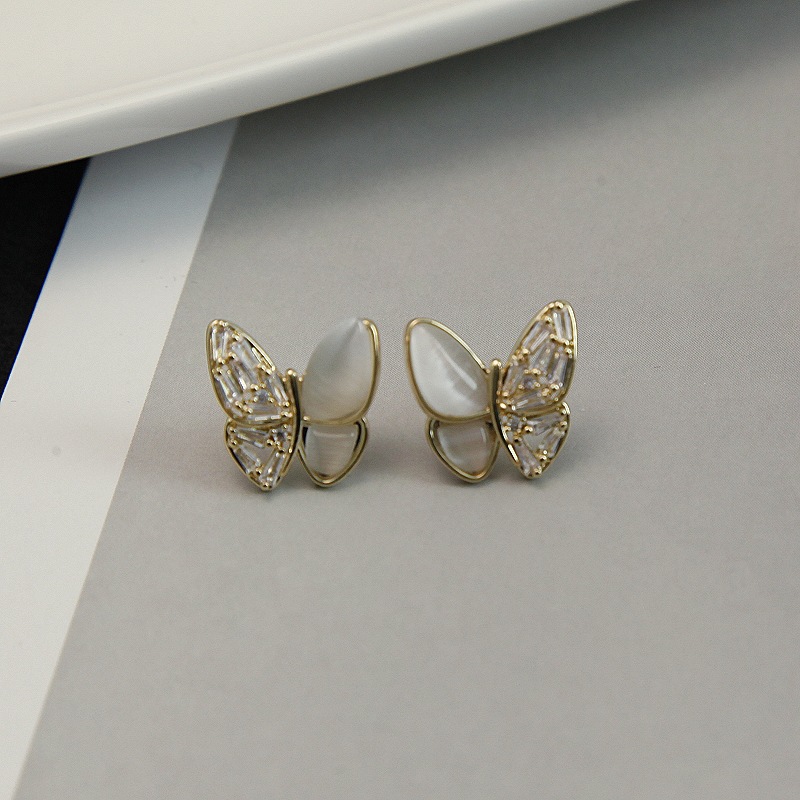 轻奢铜镀金色锆石天然贝母蝴蝶气质耳钉S925银针简约甜美耳饰女潮