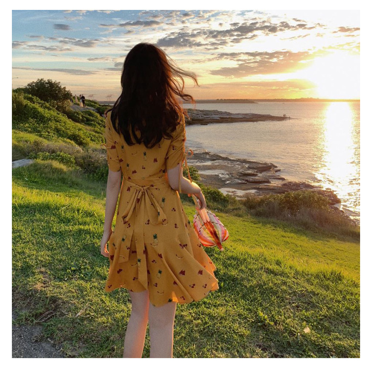 夏季海边度假沙滩裙超仙女森系小个子温柔风水果印连衣裙子