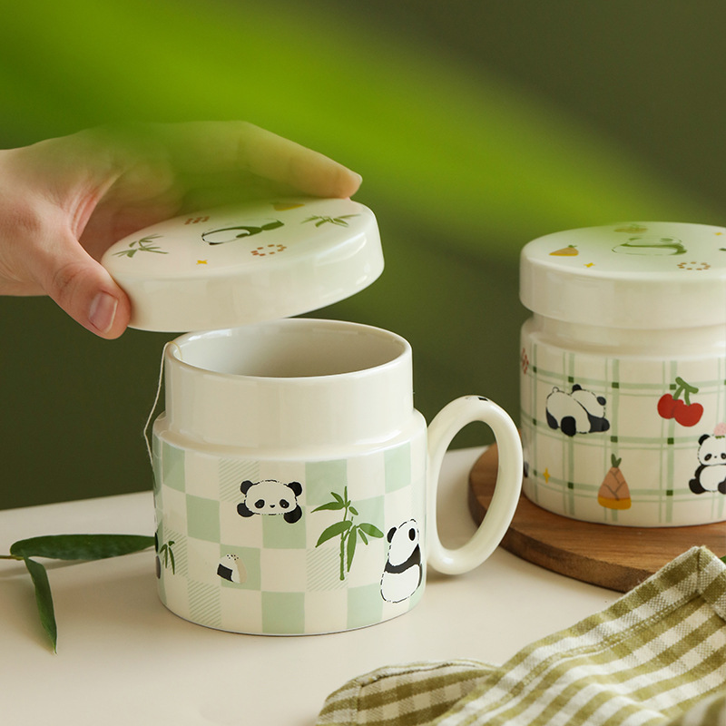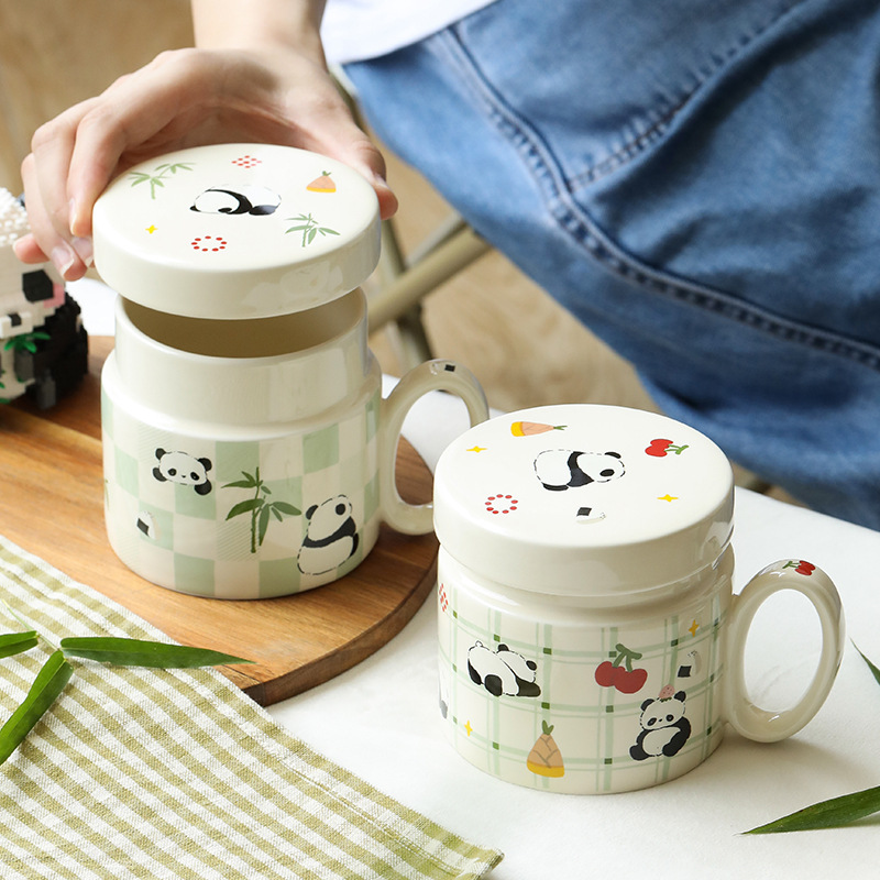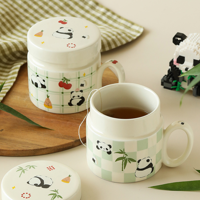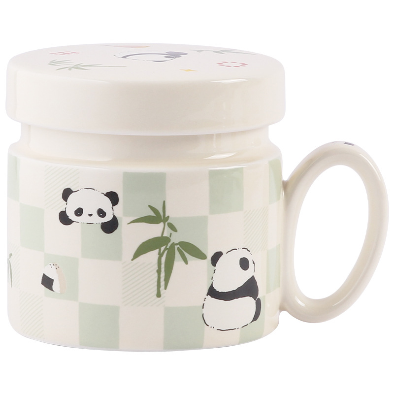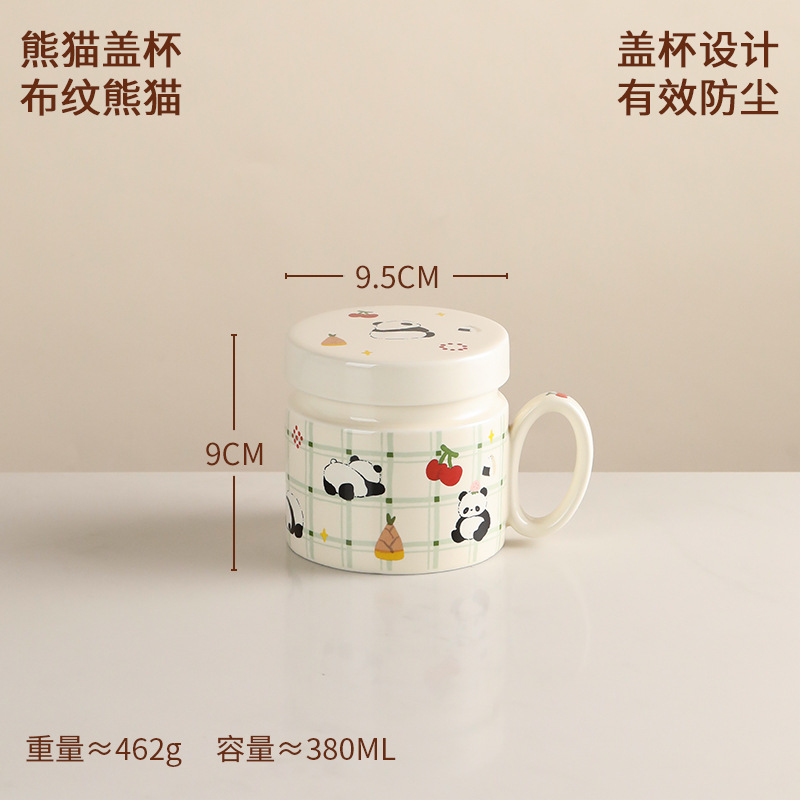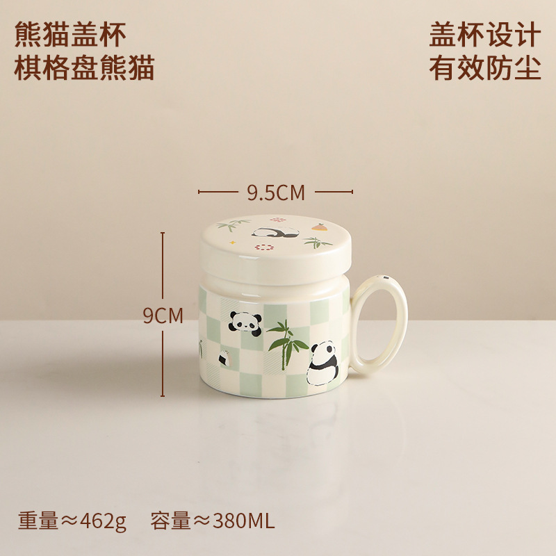 熊猫小花花陶瓷盖杯可爱设计感杯子茶杯小众马克杯家用水杯