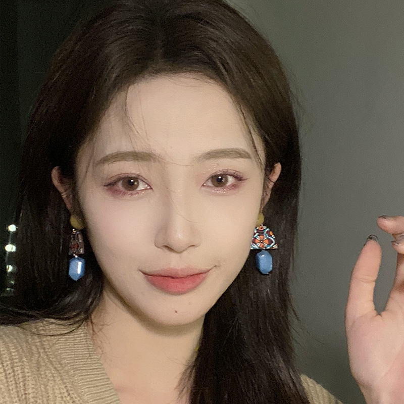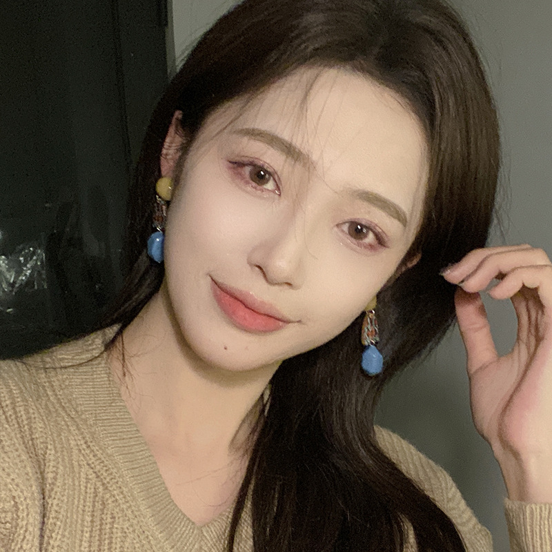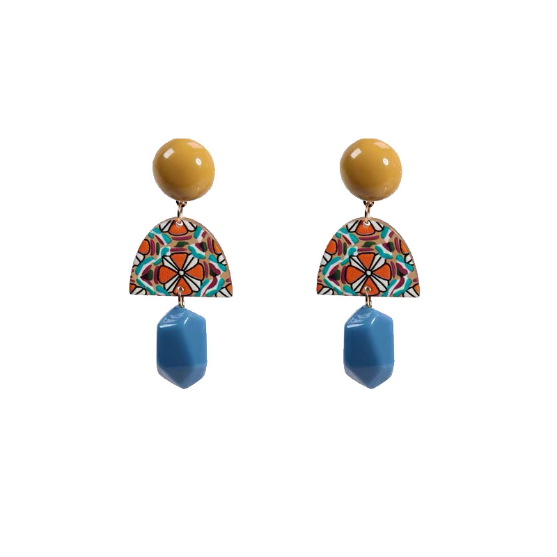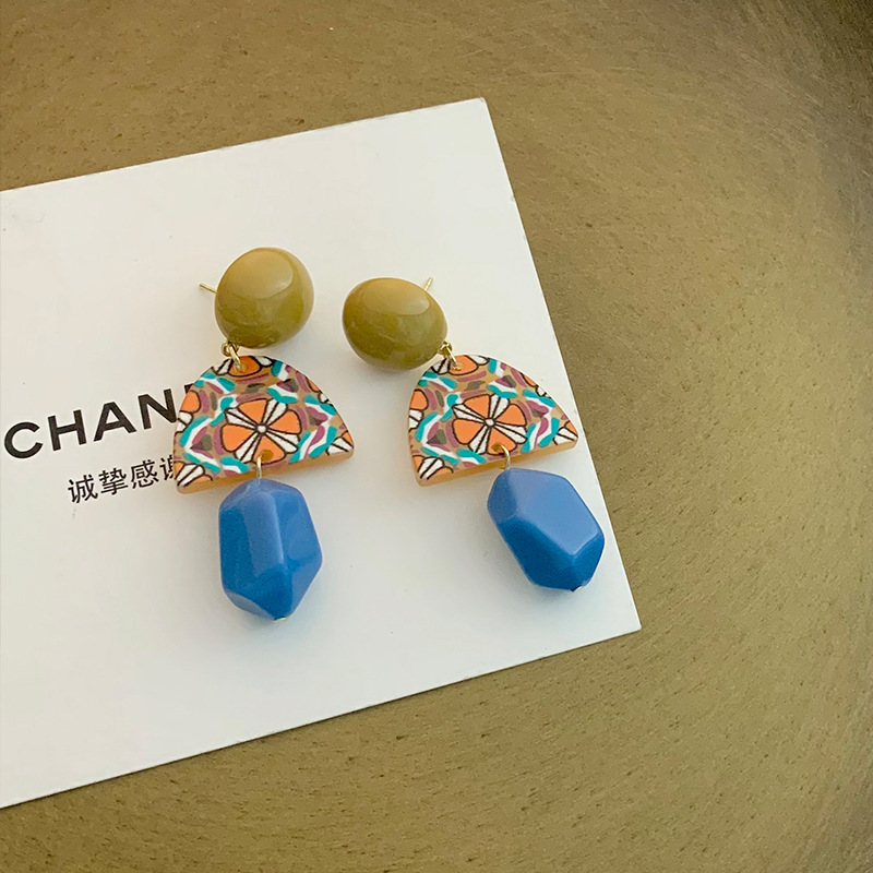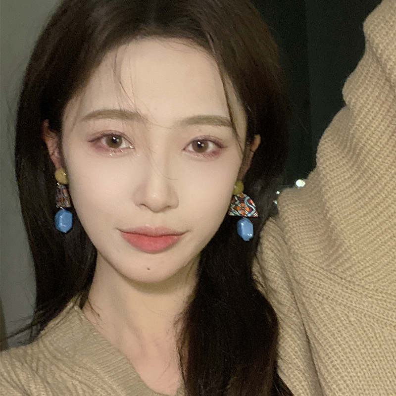 日系复古黄蓝色撞色树脂长耳环女港风优雅莫兰迪艺术几何耳钉耳饰