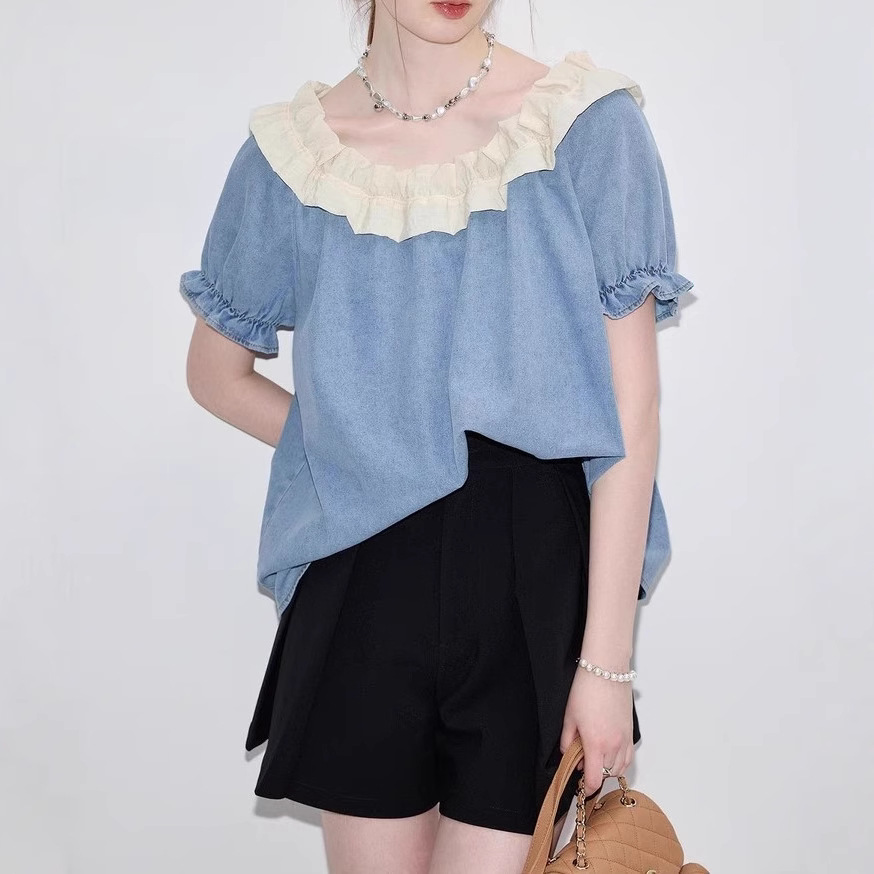 牛仔衬衫女2025年夏季新款法式小众宽松荷叶边圆领短袖上衣