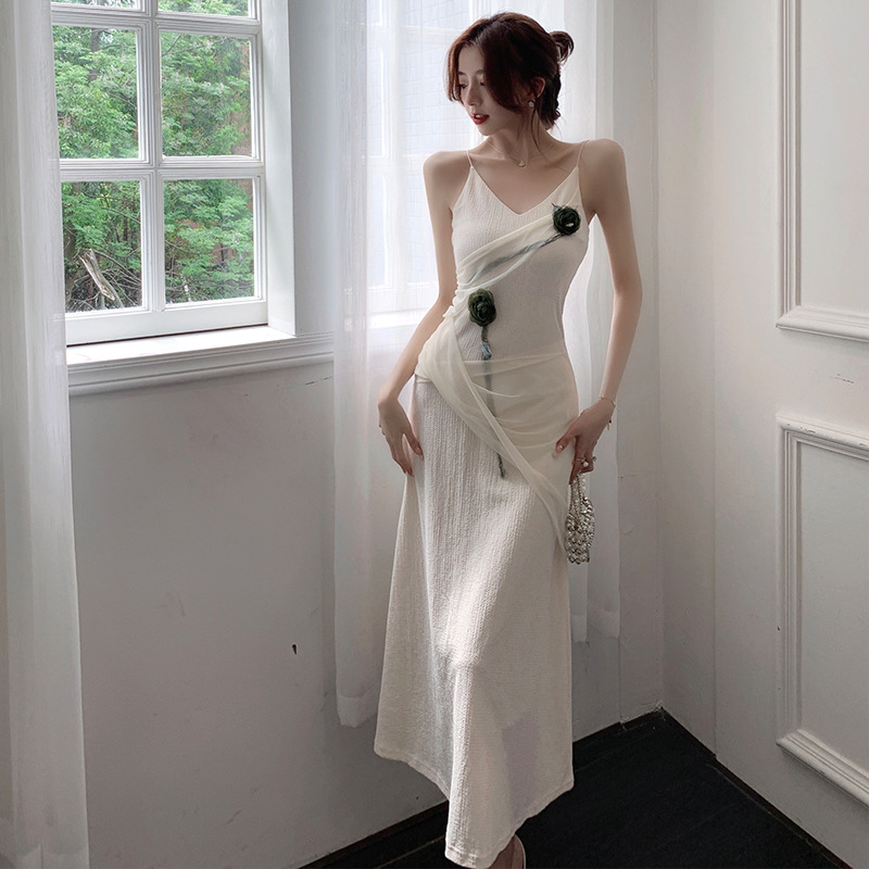 法式复古山茶花V领连衣裙夏新款修身显瘦气质吊带裙白色长裙