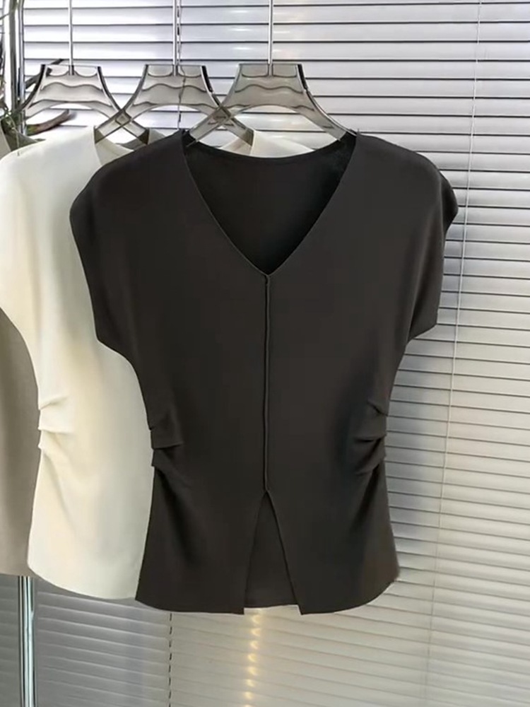 纯色V领无袖针织衫女夏新款冰丝软糯褶皱收腰显瘦开叉上衣潮