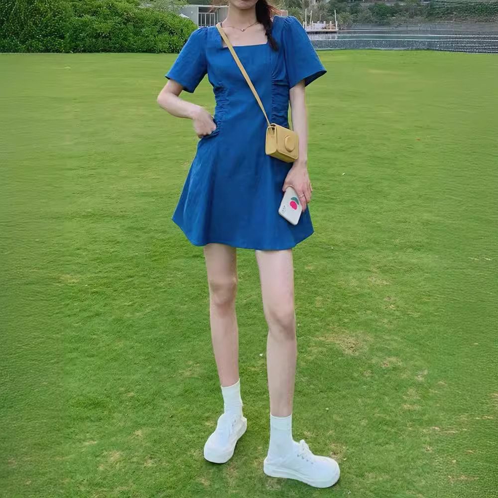 夏季新款法式收腰设计感减龄小个子短裙气质蓝色方领连衣裙女