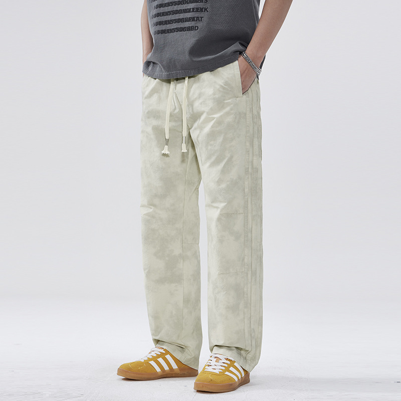春季新款美式复古休闲裤男士街头扎染宽松极简微弹侧边三杠直筒裤