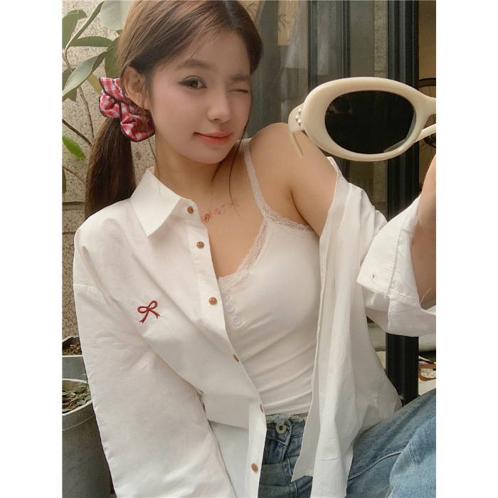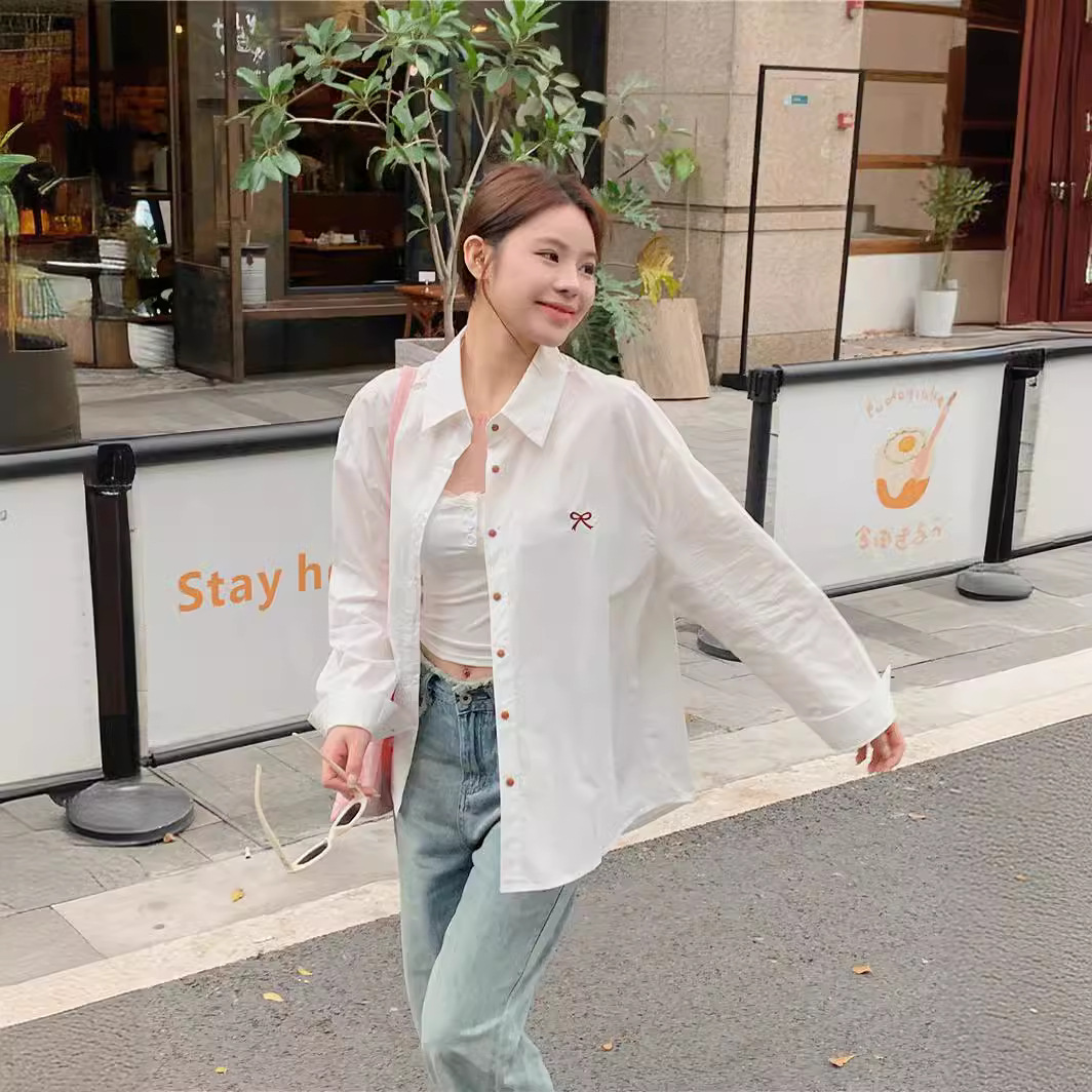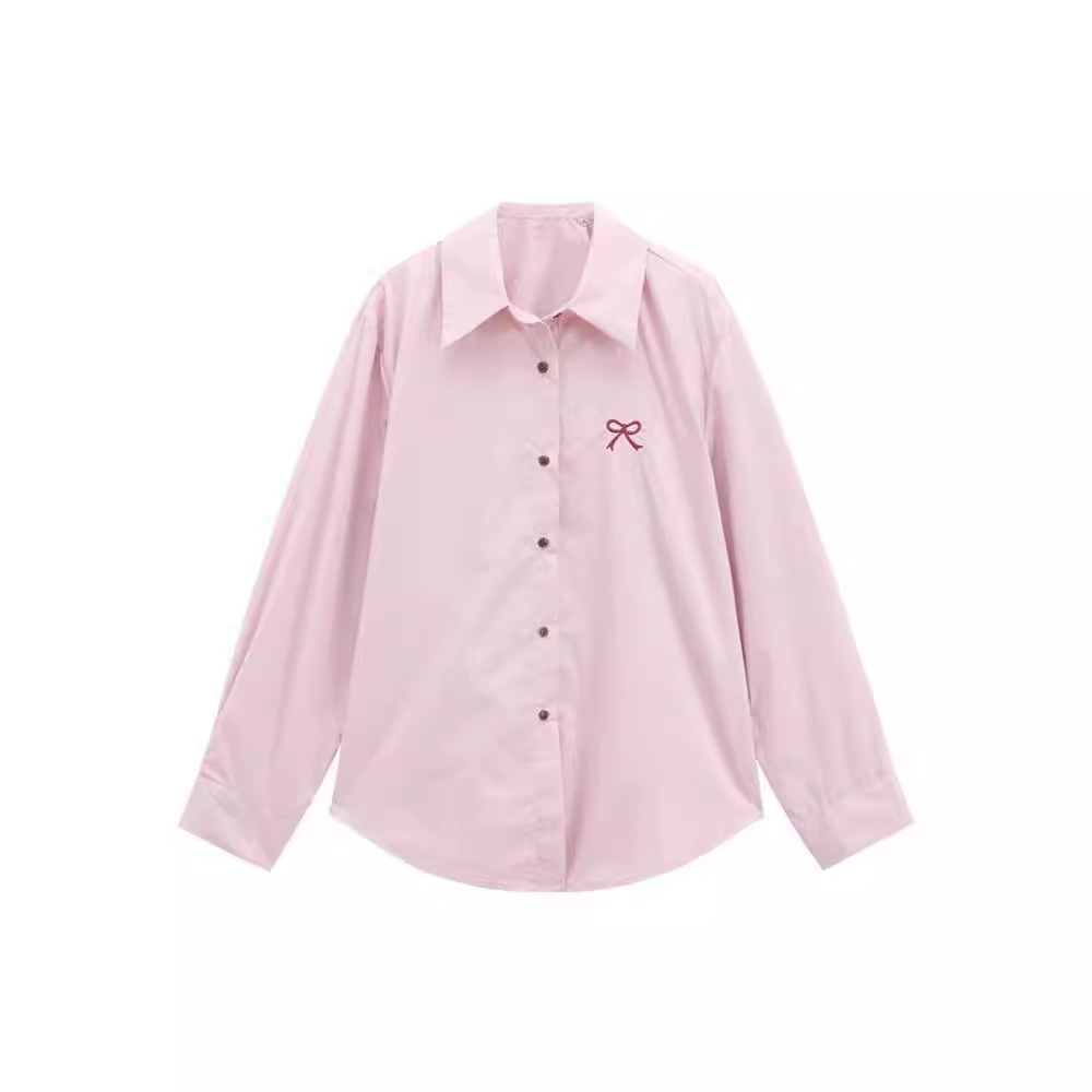 温柔风粉色蝴蝶结刺绣polo领衬衫女宽松休闲长袖上衣