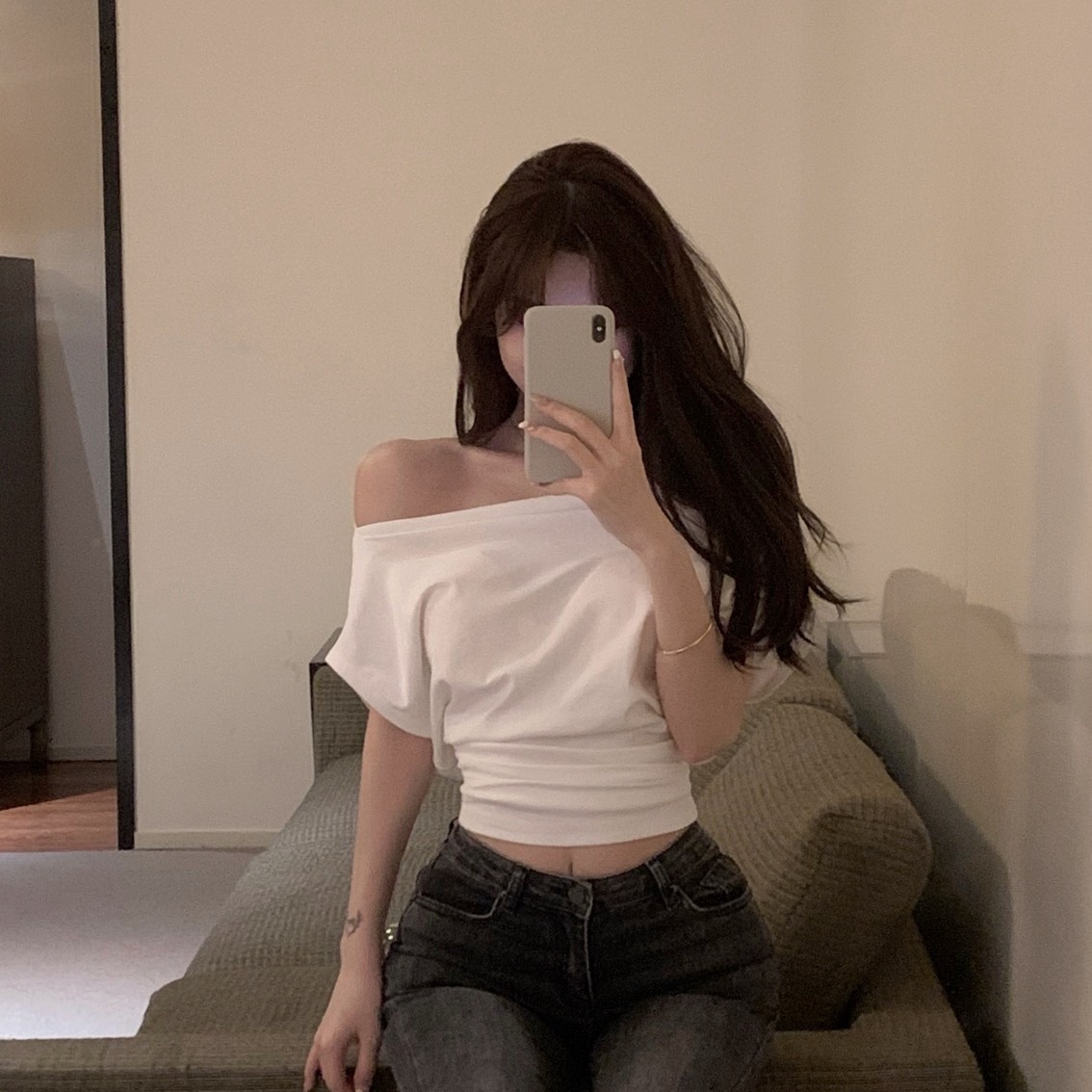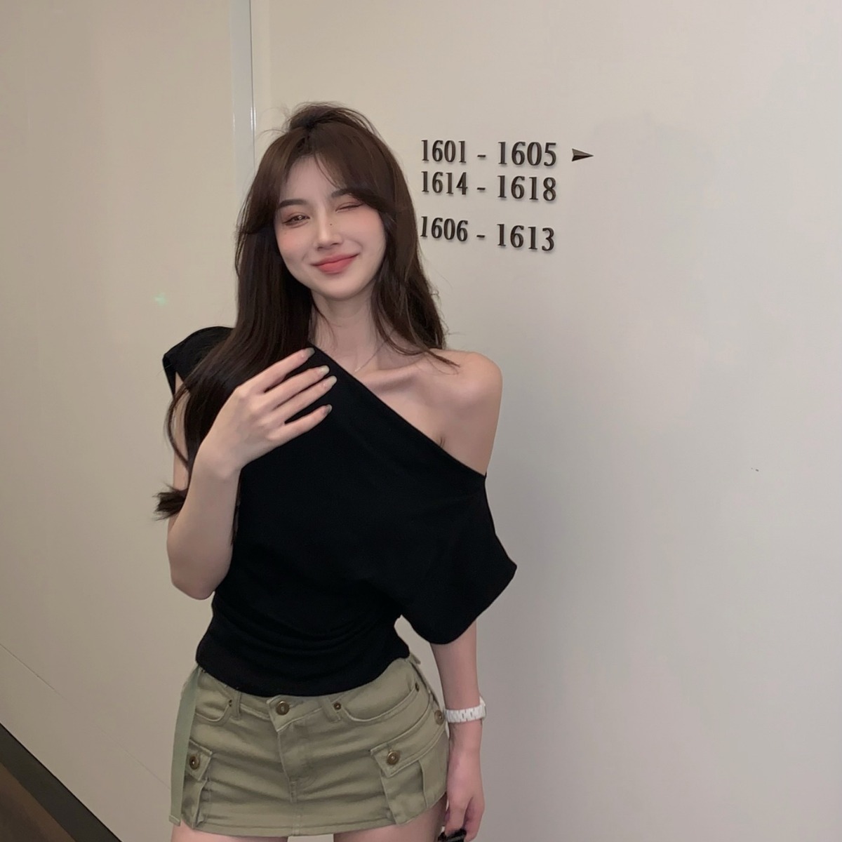 设计感小众T恤女短款辣妹露肩性感修身显瘦短袖上衣