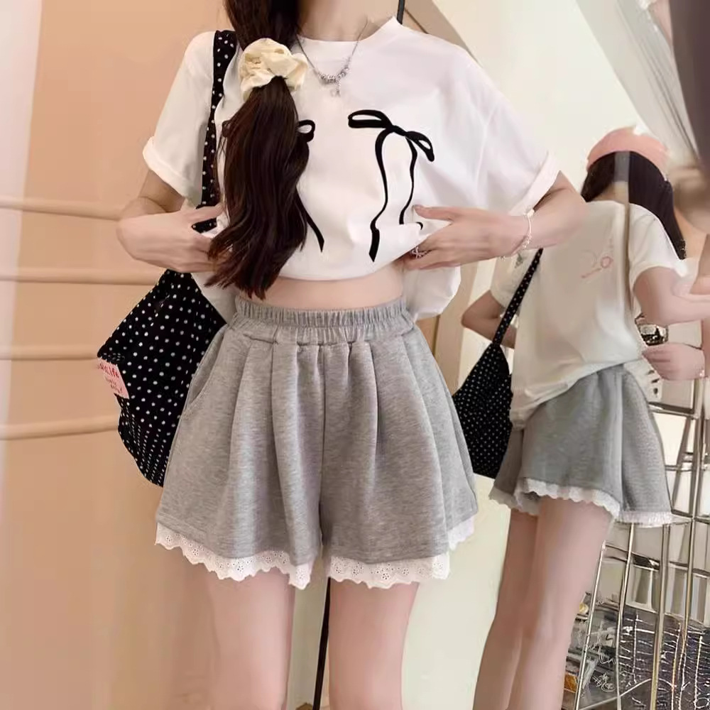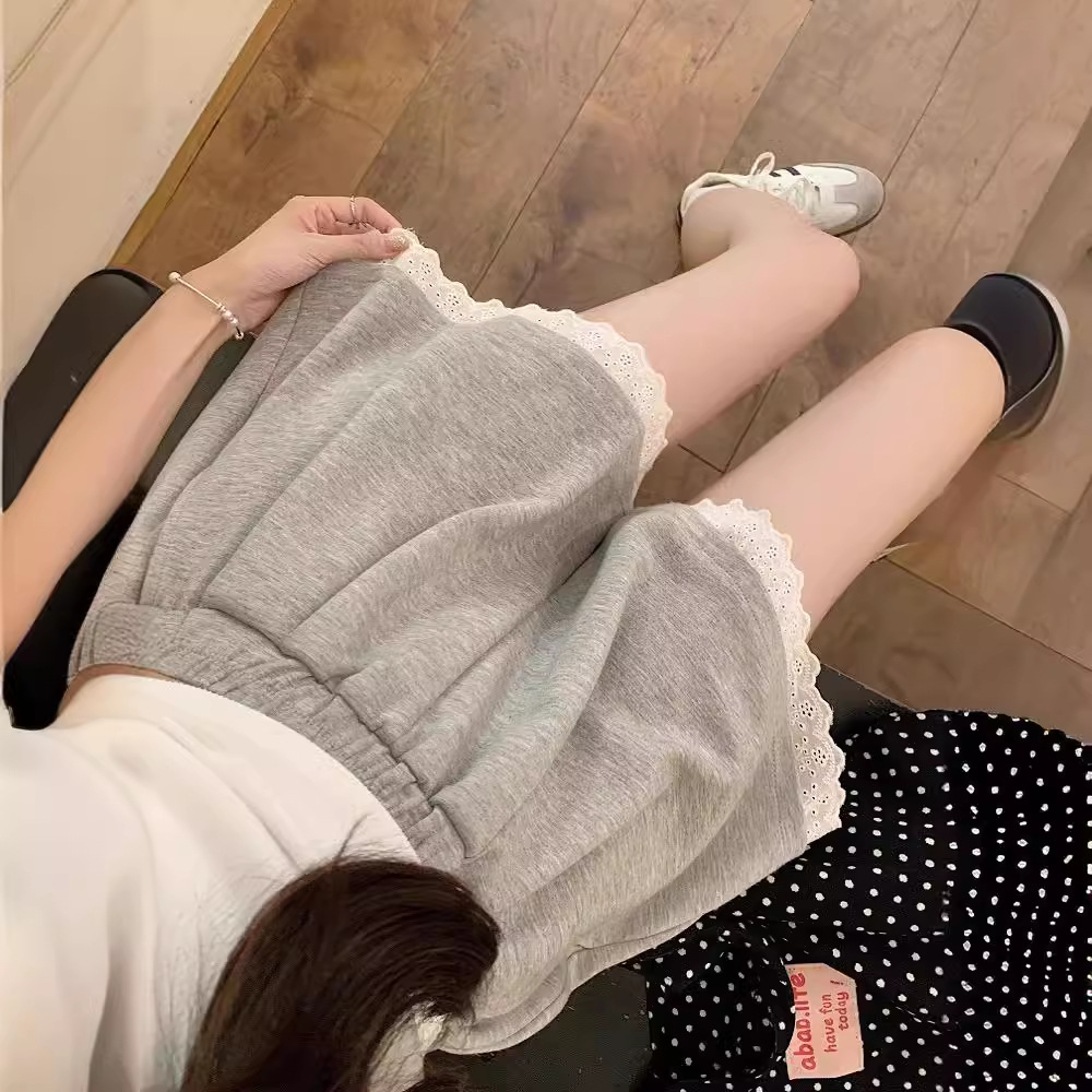 蕾丝花边休闲裤女显瘦松紧腰宽松阔腿裤小众外穿短裤