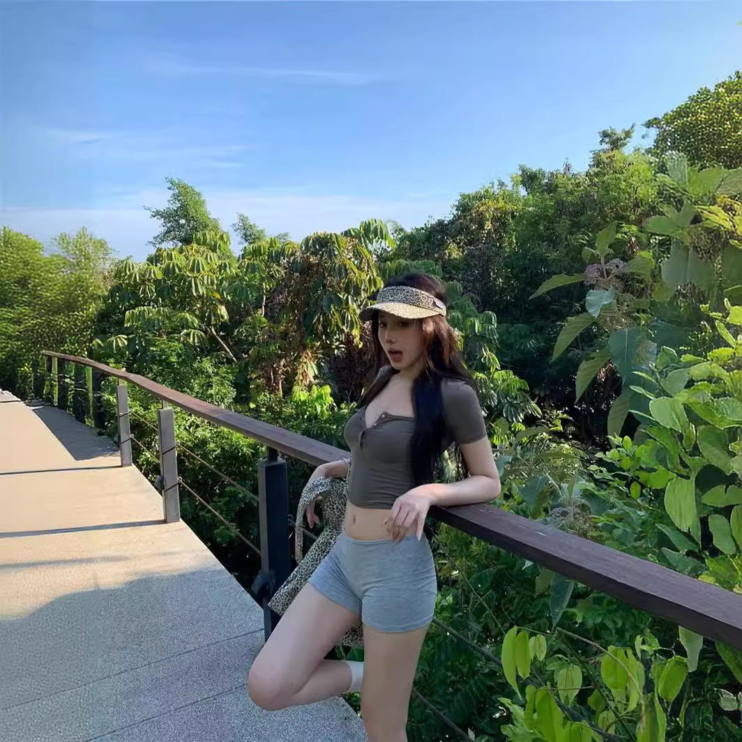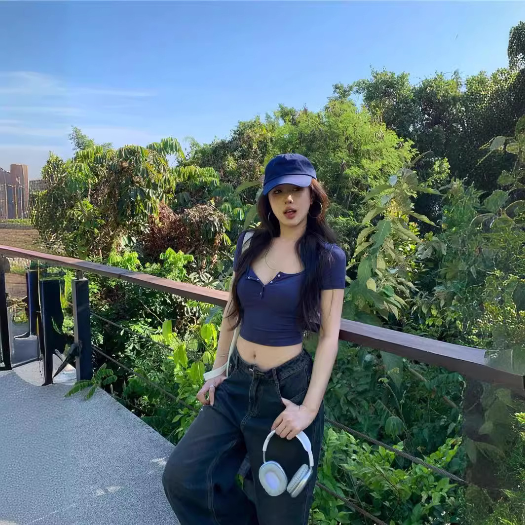 美式辣妹纯欲短袖T恤收腰露脐蓝色显瘦短款chic上衣