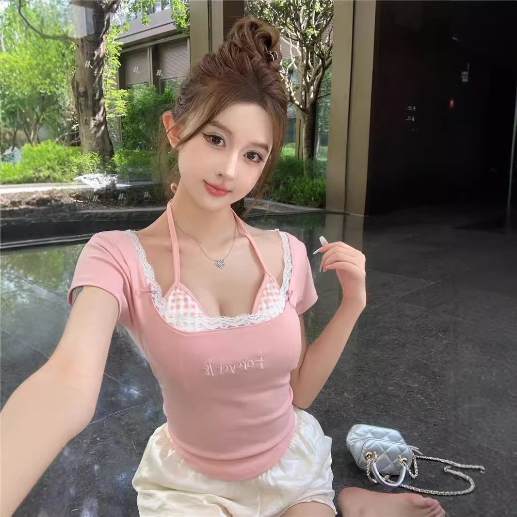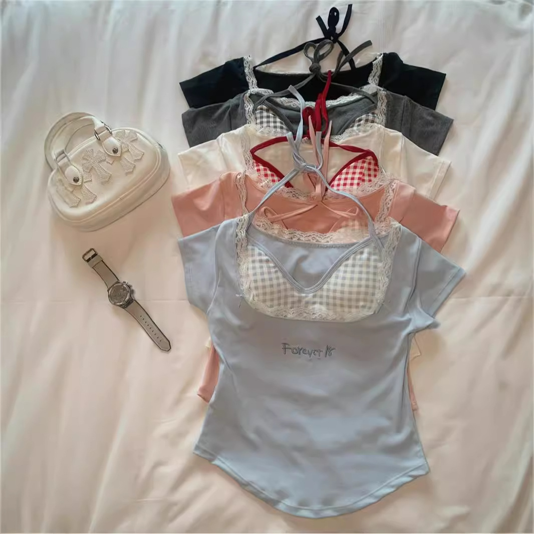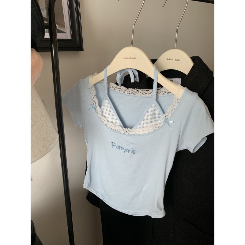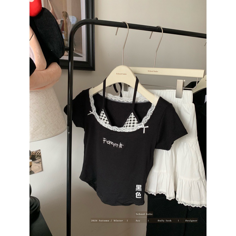 纯欲风方领刺绣格子假两件短袖T恤女修身显瘦短款上衣服