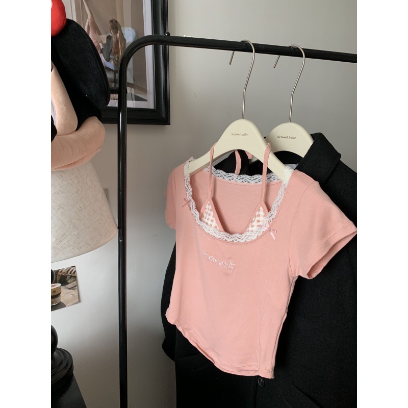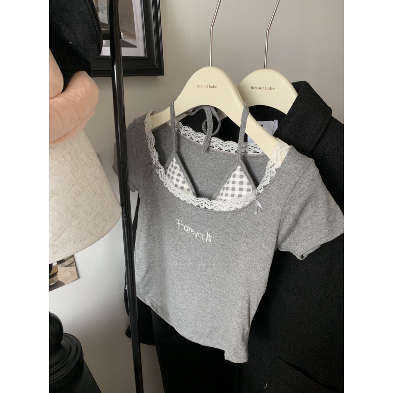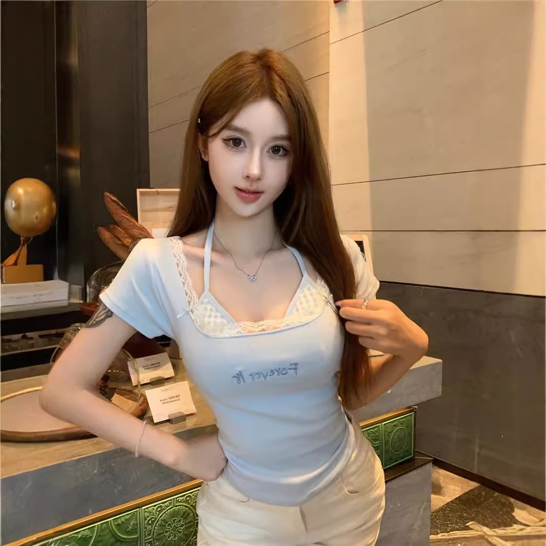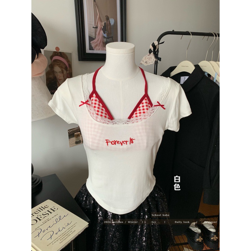 纯欲风方领刺绣格子假两件短袖T恤女修身显瘦短款上衣服