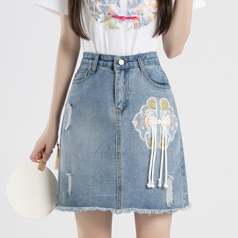新中式国风高腰开叉牛仔裙半身裙女夏季新款复古刺绣a字短裙