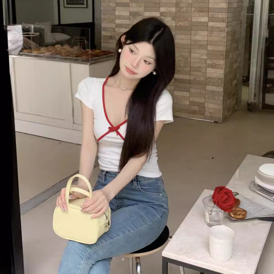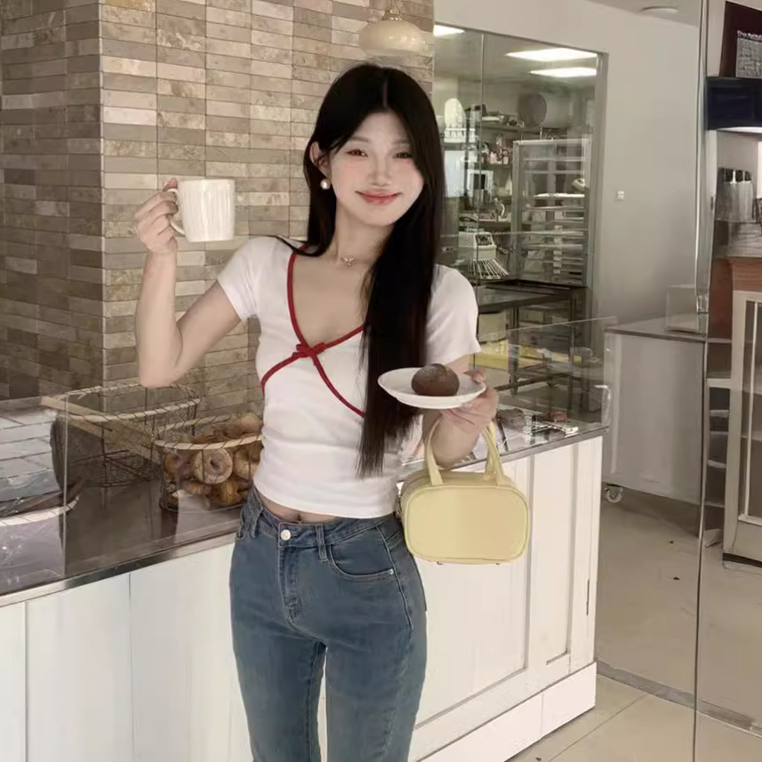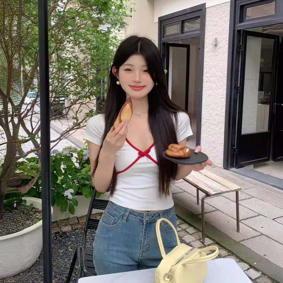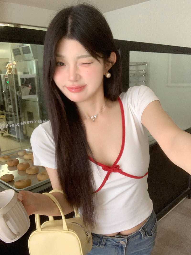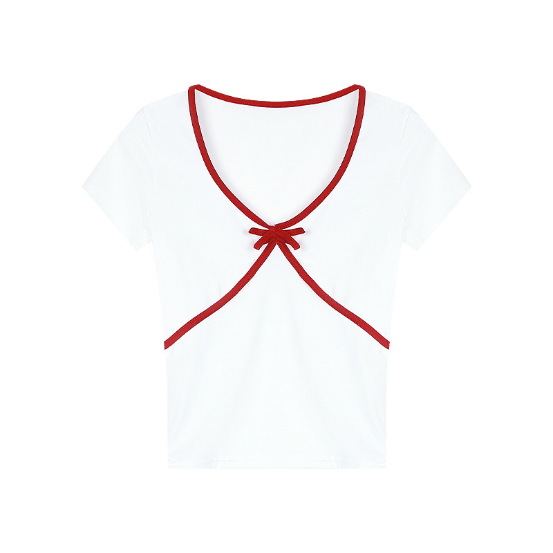设计感撞色V领短袖t恤女新款夏季立体蝴蝶结修身甜辣小众上衣