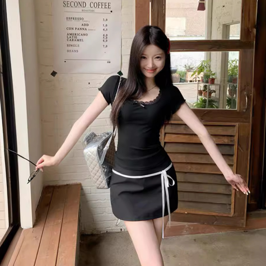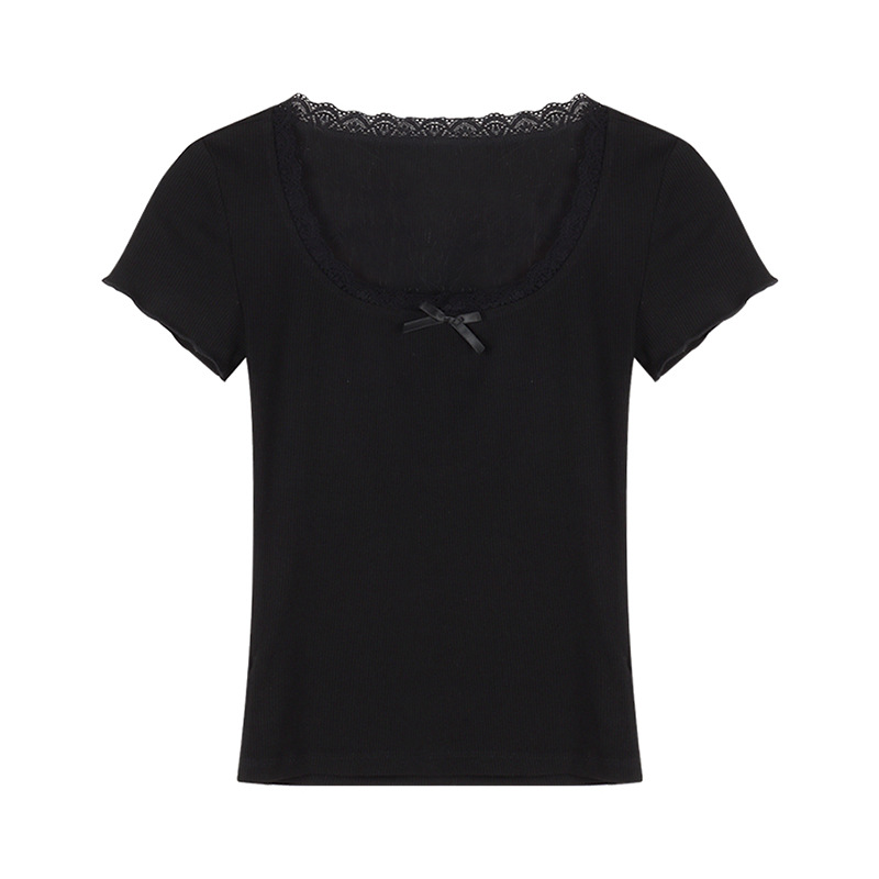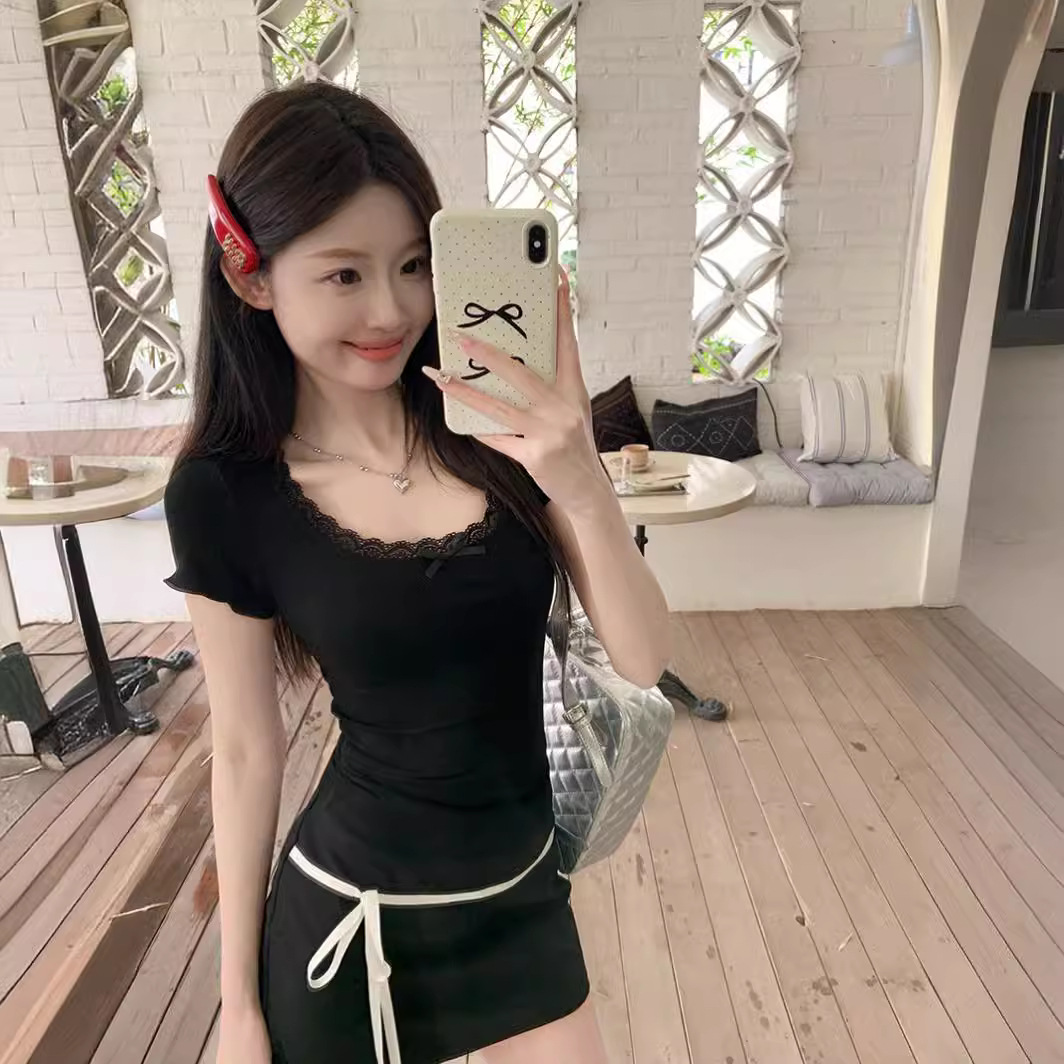 纯欲黑色蕾丝边短袖正肩T恤女夏季修身打底衫chic甜辣妹短款上衣