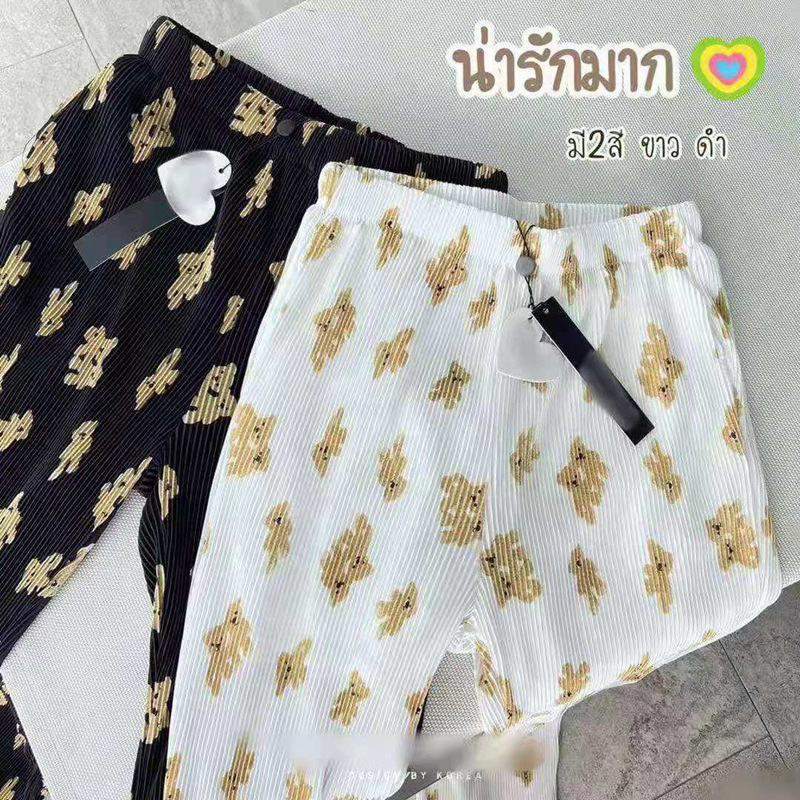 卡通小熊印花长裤女夏季新款宽松休闲百褶阔腿裤子外贸