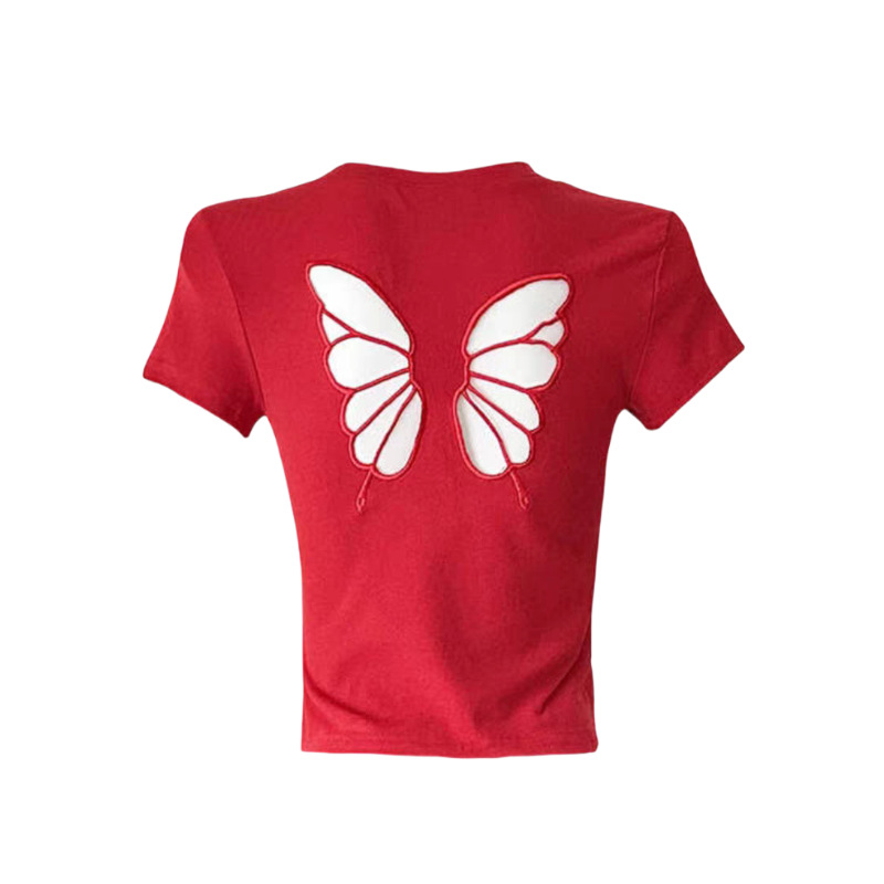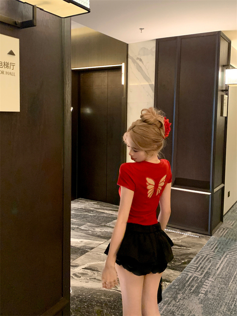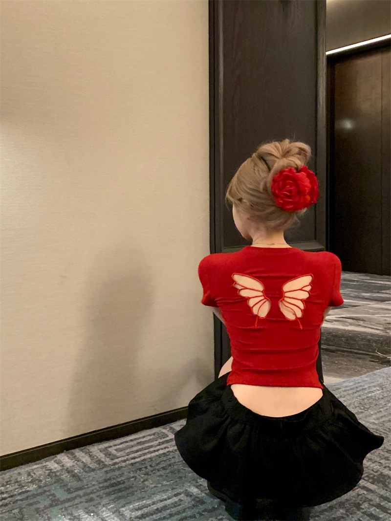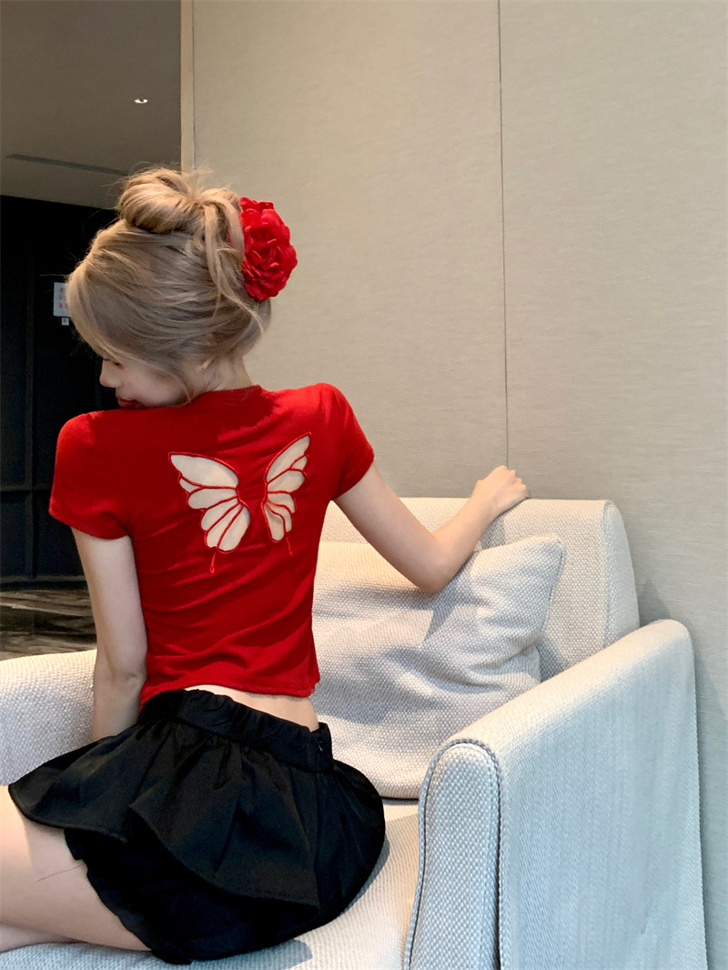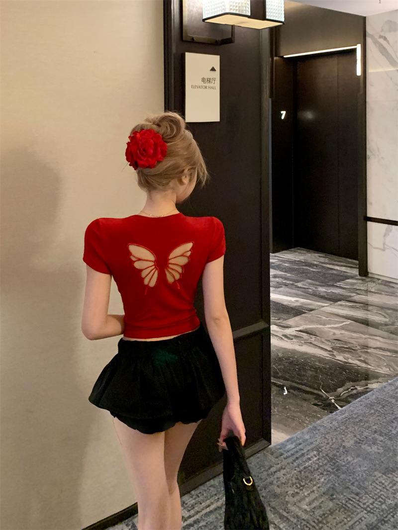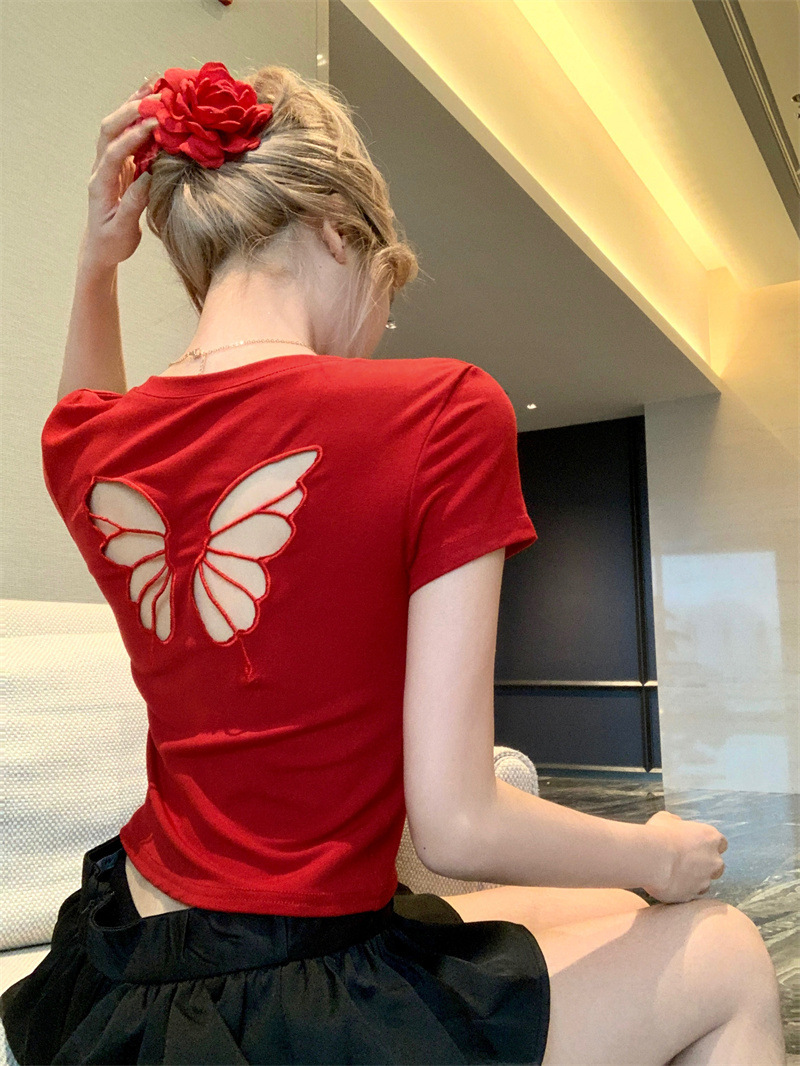 蝴蝶刺绣镂空圆领短袖T恤女夏季设计感小众修身辣妹短款红色上衣