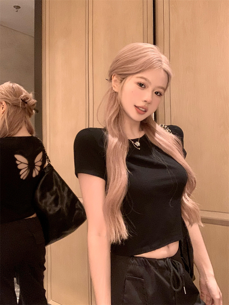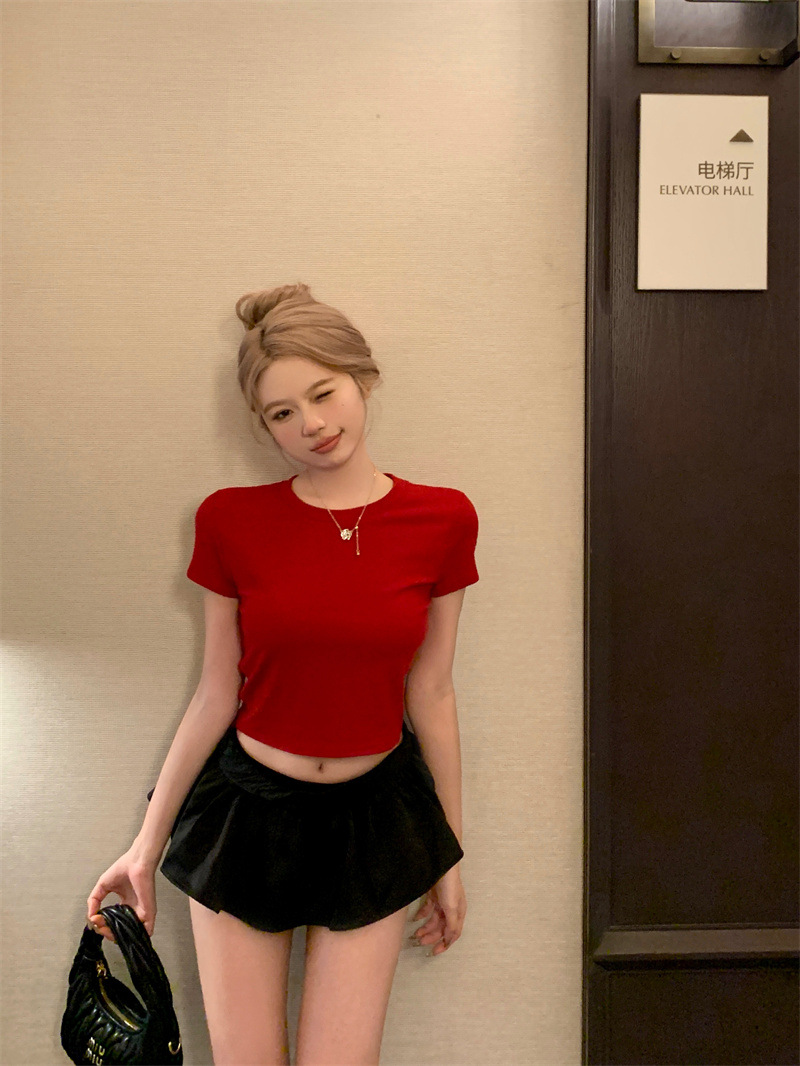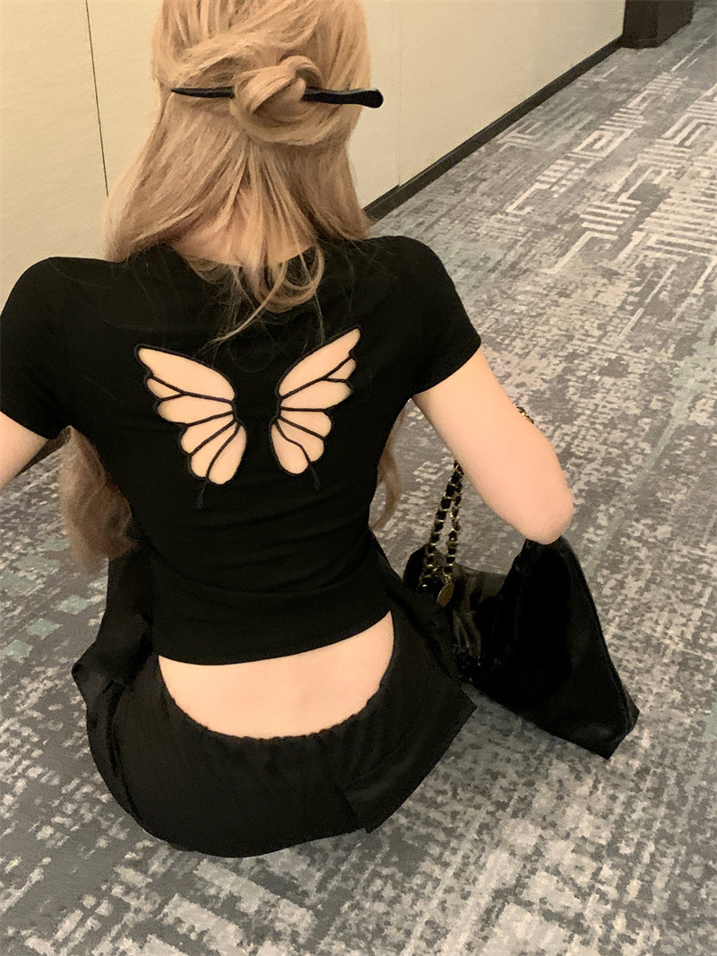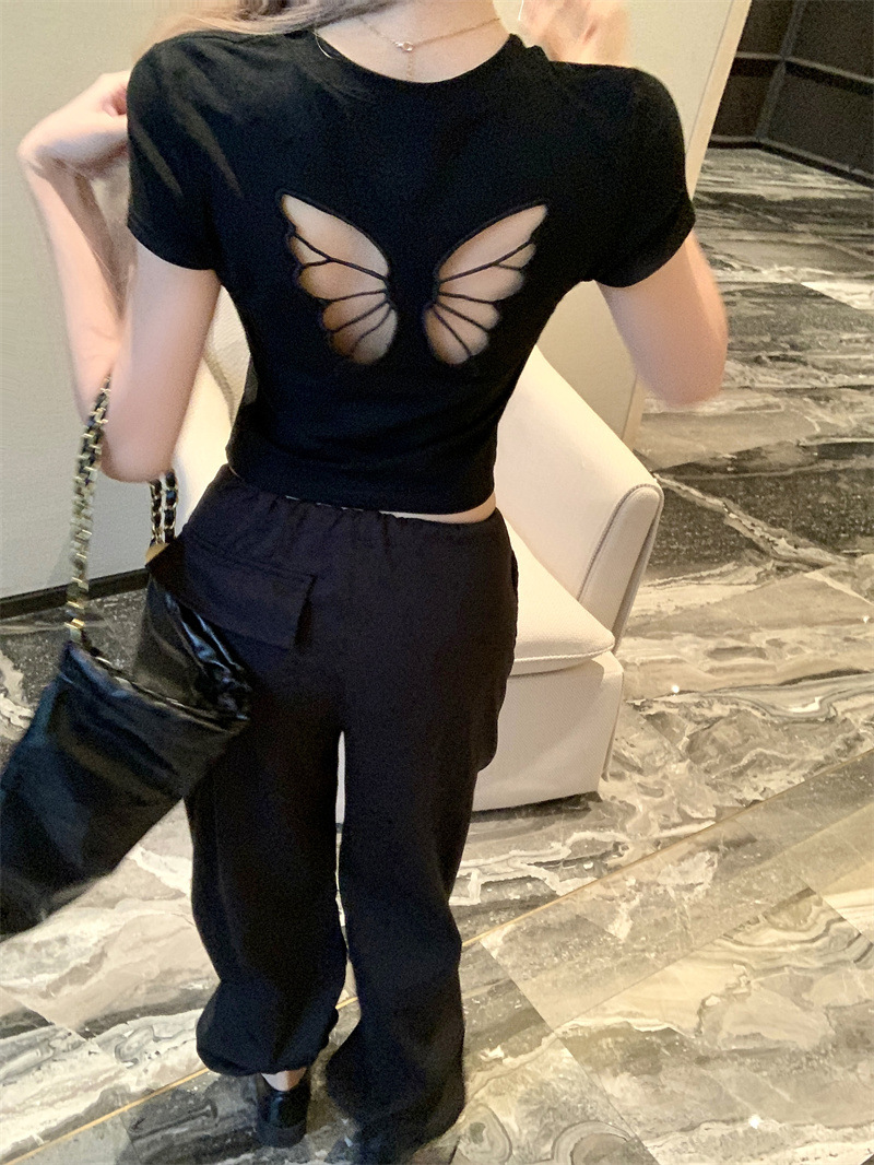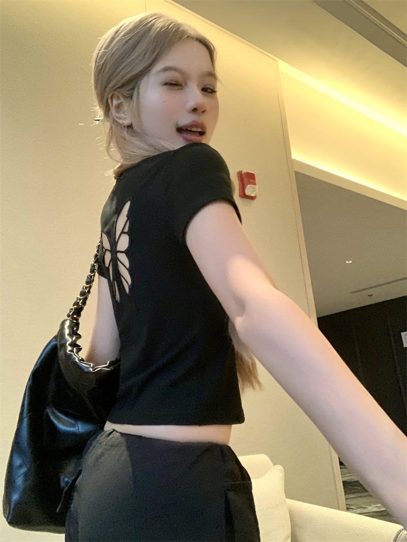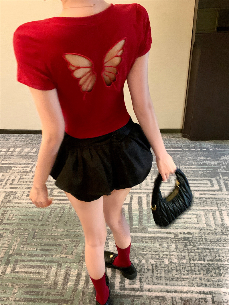 蝴蝶刺绣镂空圆领短袖T恤女夏季设计感小众修身辣妹短款红色上衣