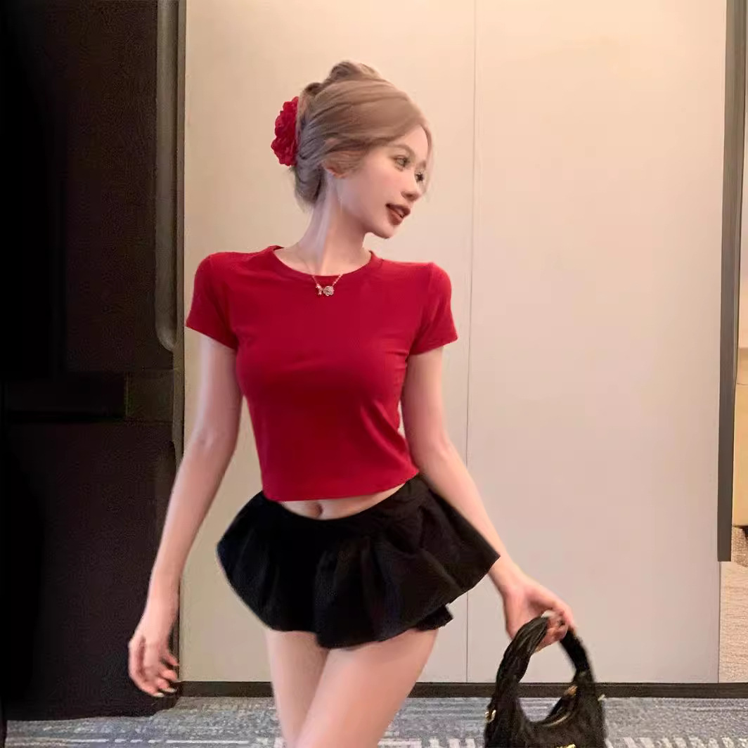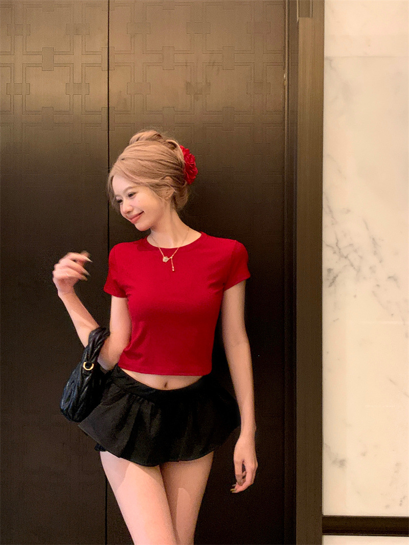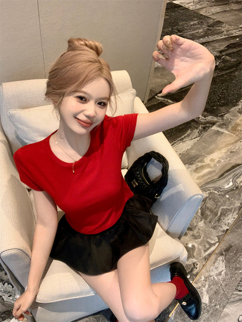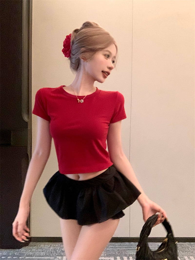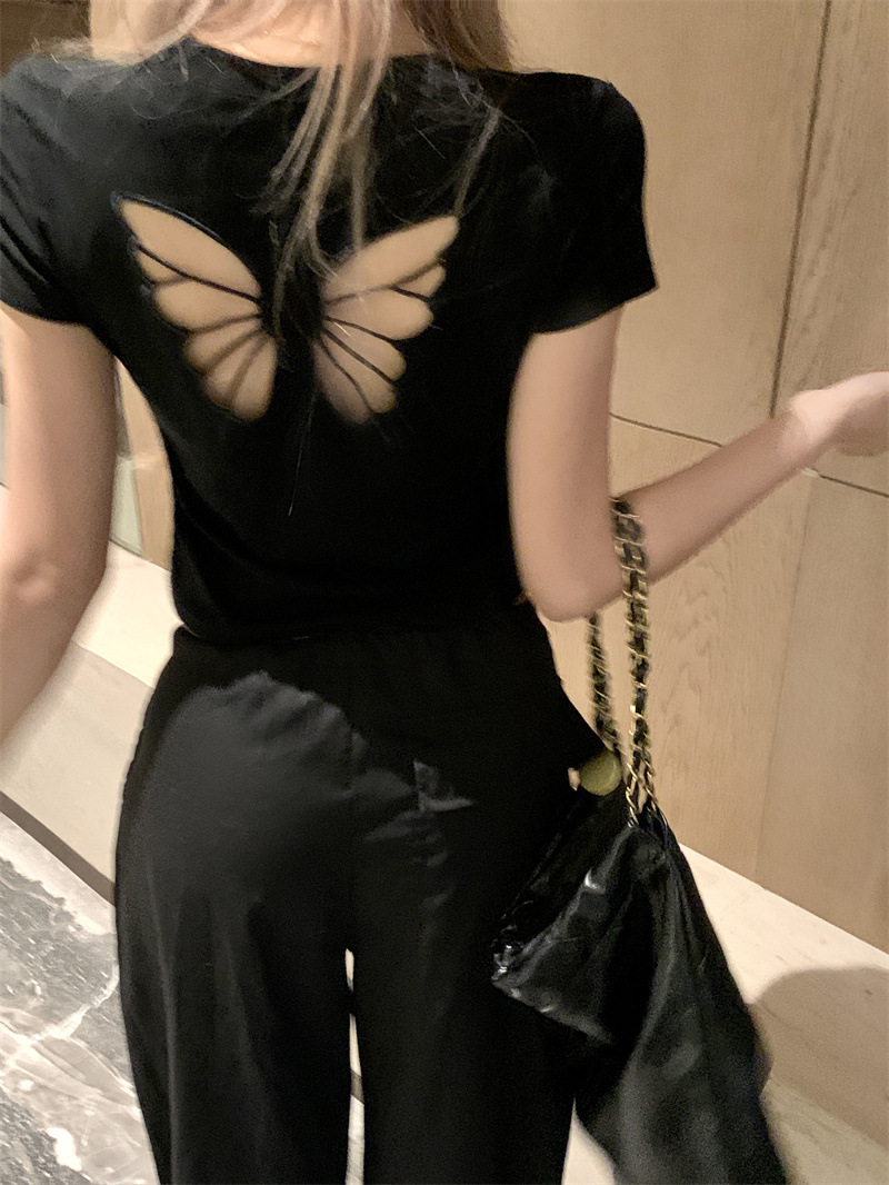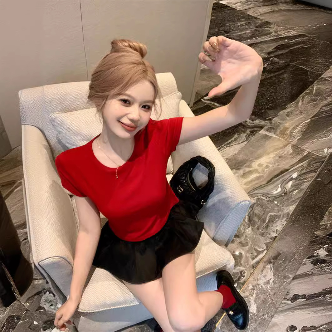 蝴蝶刺绣镂空圆领短袖T恤女夏季设计感小众修身辣妹短款红色上衣