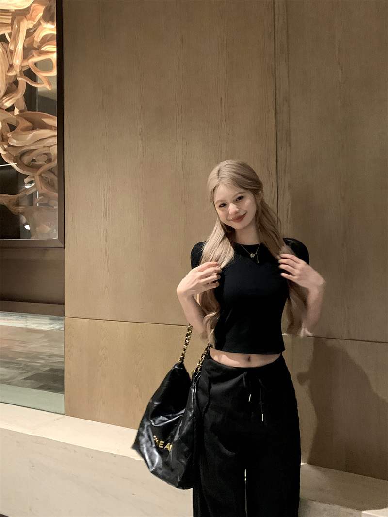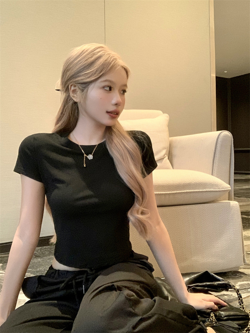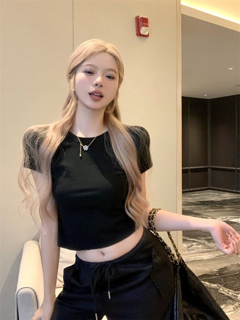 甜辣妹短袖针织衫T恤女薄款韩系露背系带镂空别致正肩短上衣