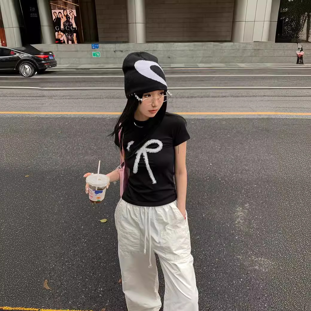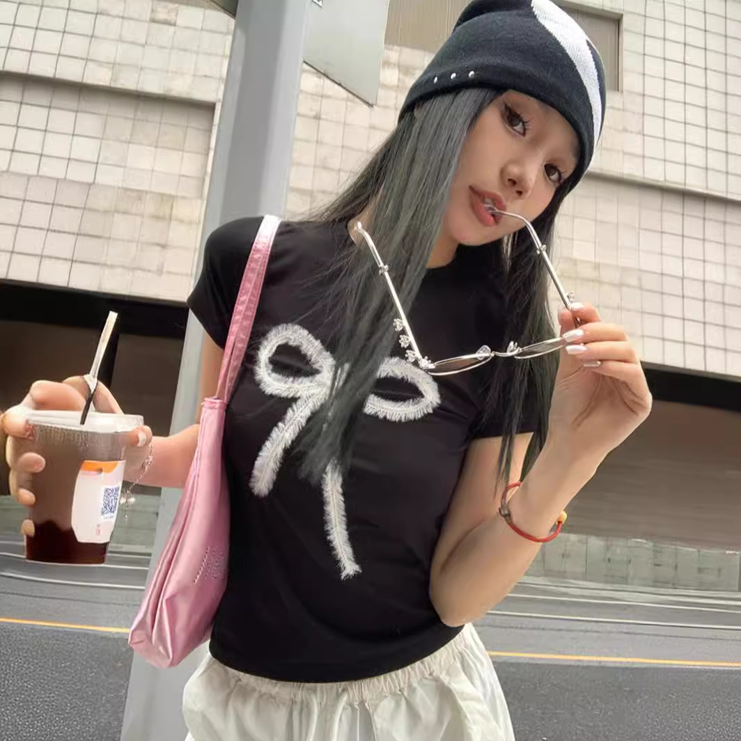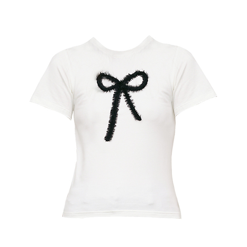 毛绒蝴蝶结圆领短袖正肩T恤女夏季设计感美式辣妹修身黑色小上衣