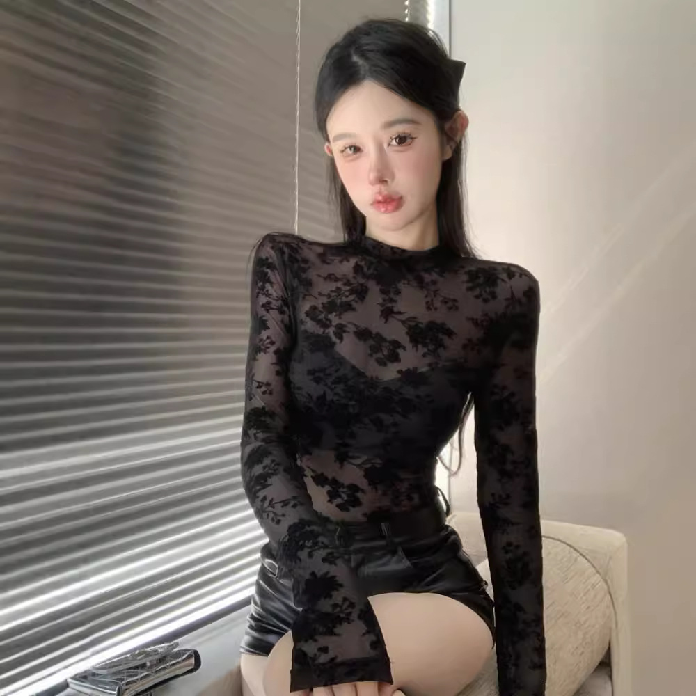 半高领性感辣妹风微透连体衣T恤女春秋植绒网纱显瘦弹力长袖上衣