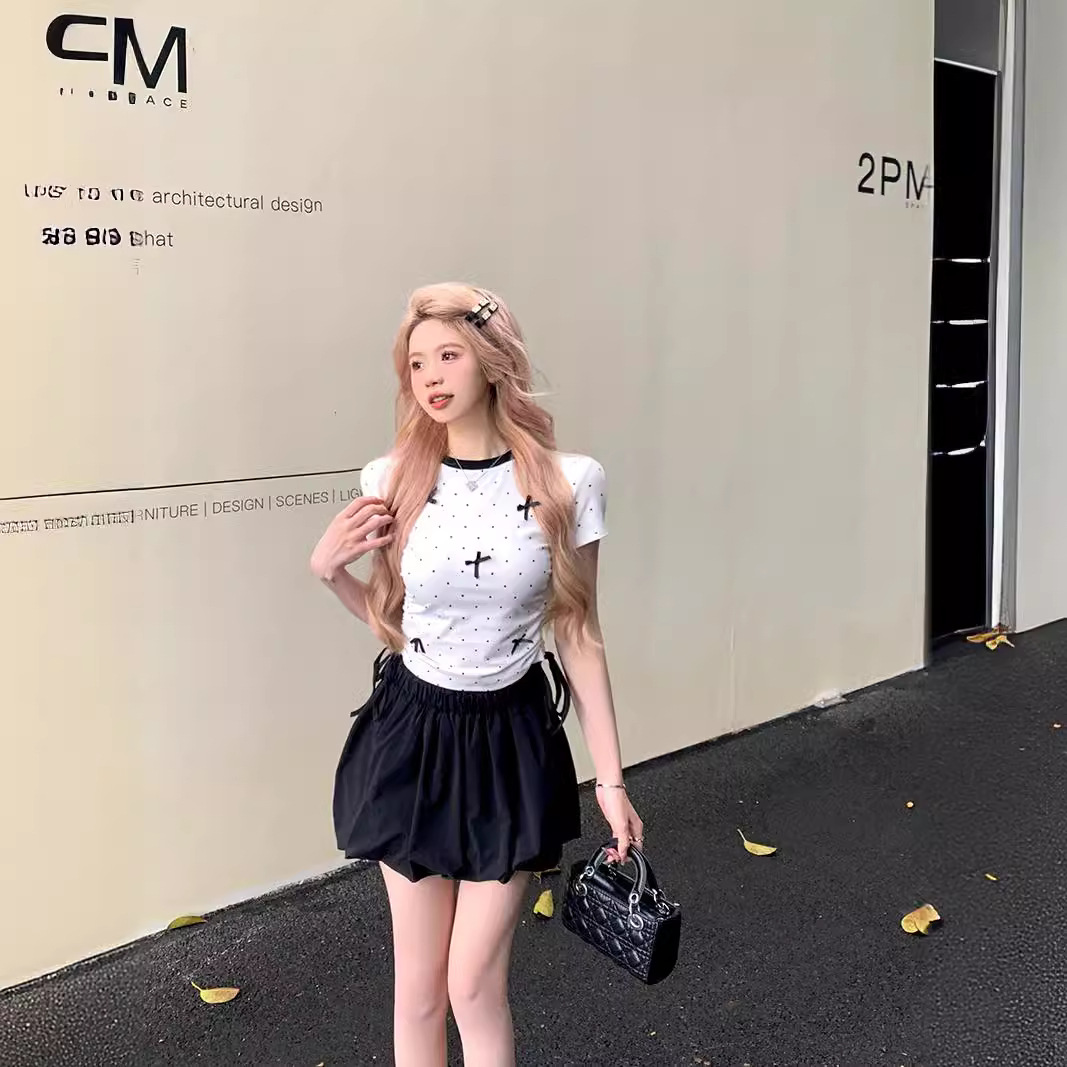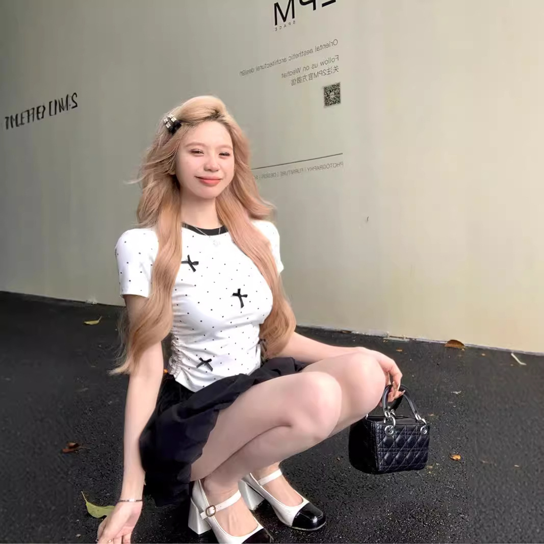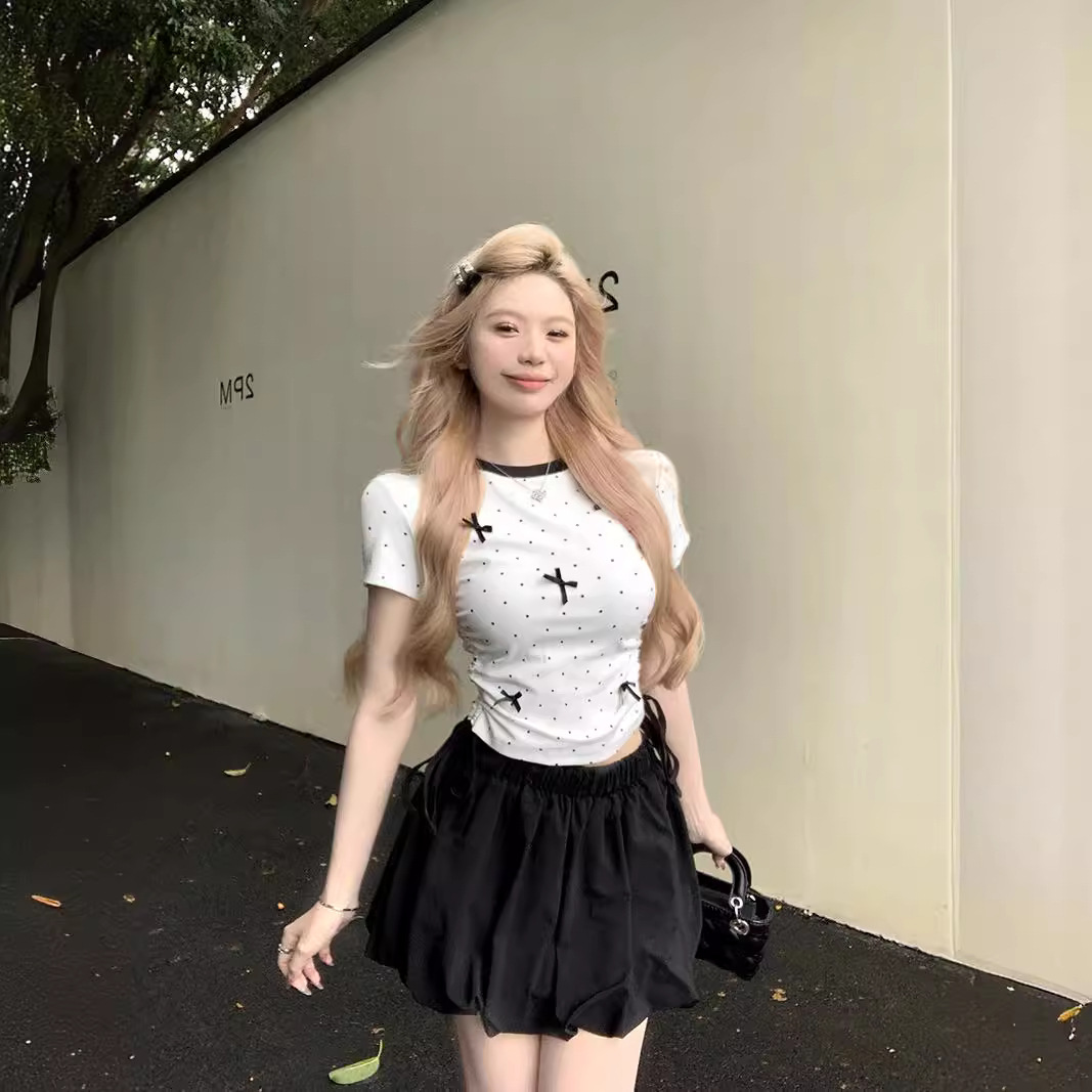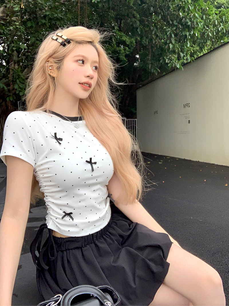 蝴蝶结波点短袖正肩T恤女夏季韩系甜美褶皱修身短款圆领撞色上衣