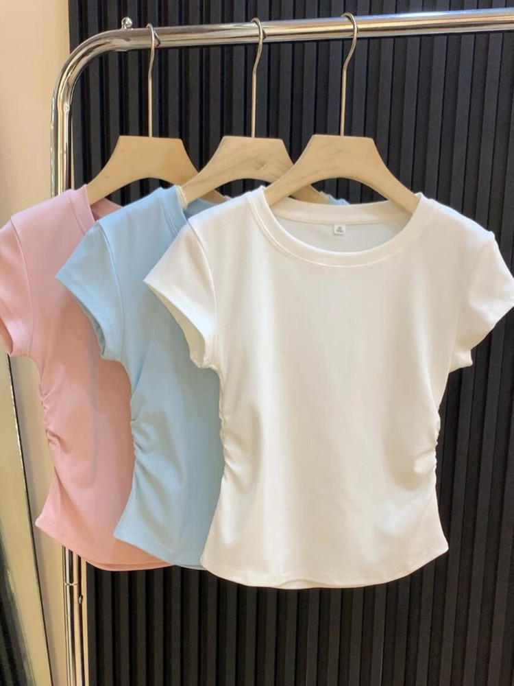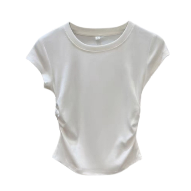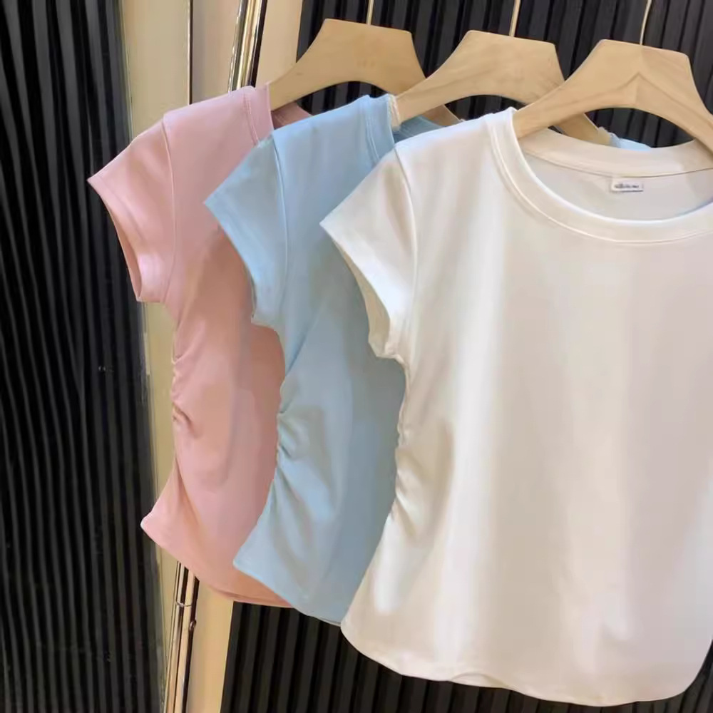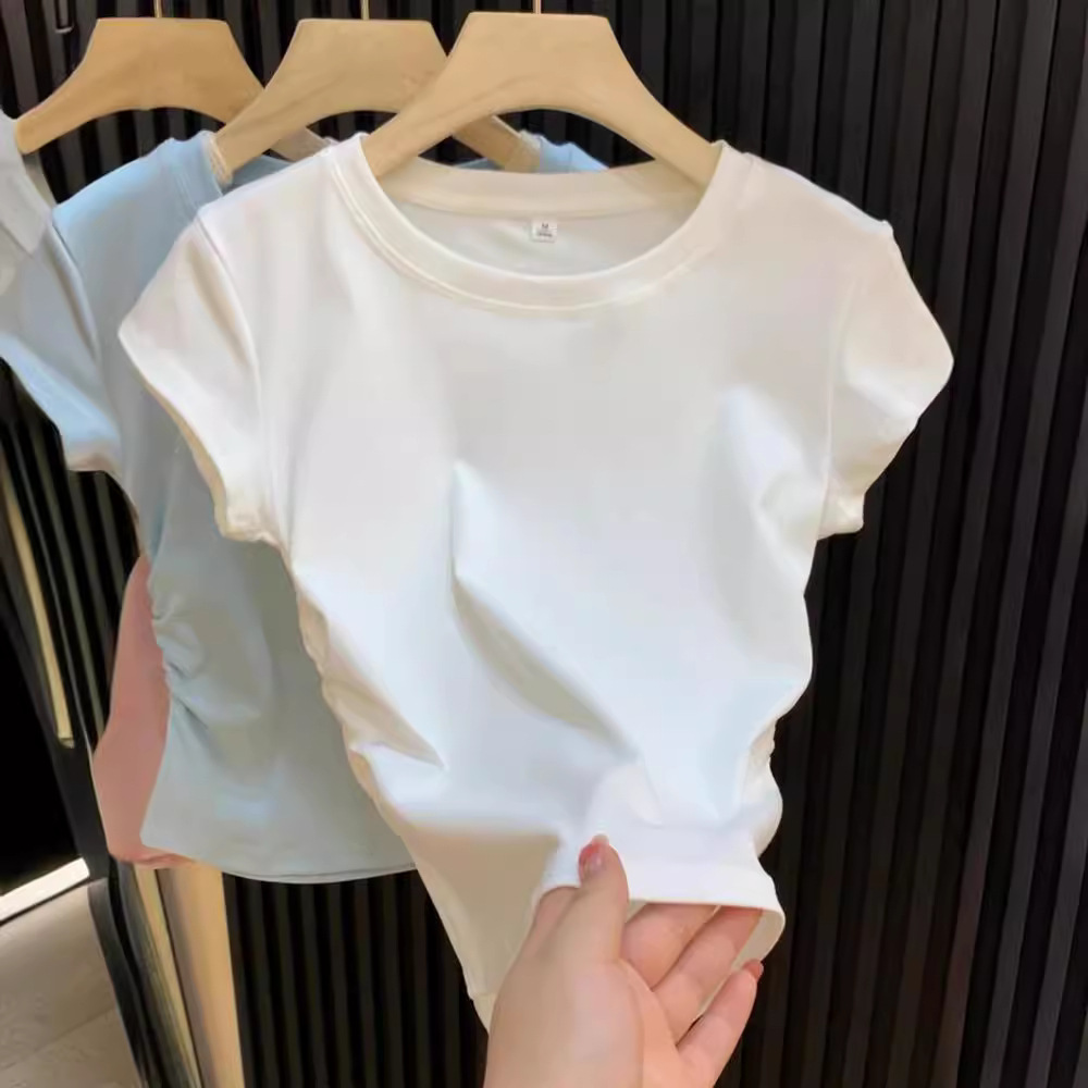 正肩短袖t恤女新款爆款夏季纯棉修身褶皱收腰短款甜辣小上衣