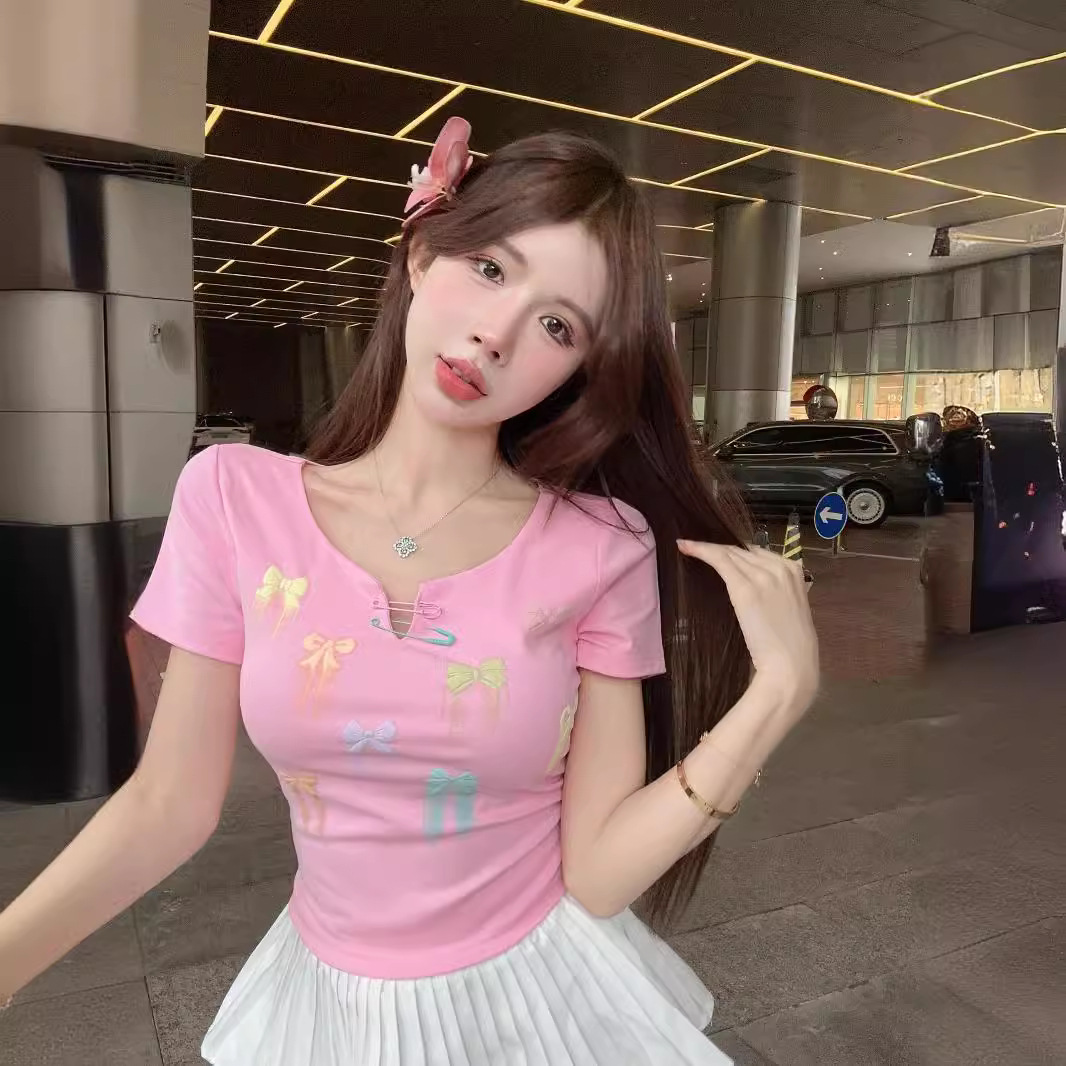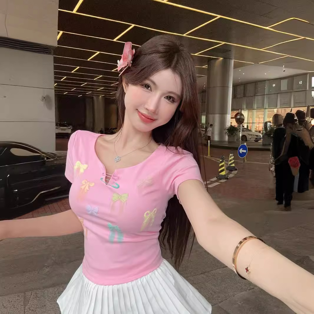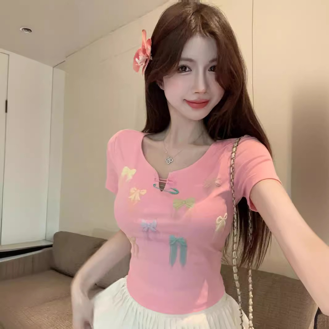 多巴胺蝴蝶结正肩短袖t恤女夏季纯欲甜美辣妹短款卡腰小上衣半袖