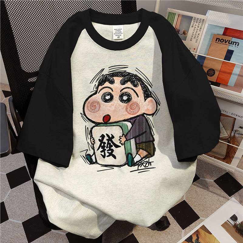 美式小众插肩袖2025夏季涂鸦纯棉短袖T恤女蜡笔小新印花大码上衣