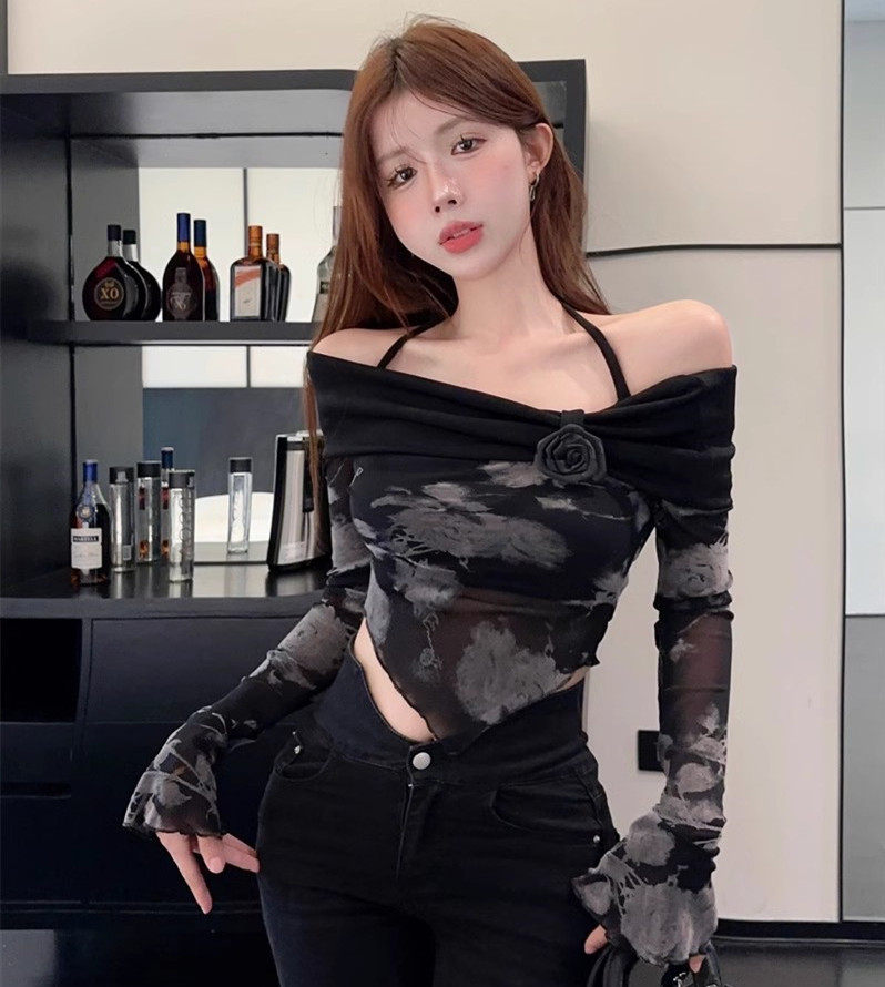 甜酷辣妹一字肩印花T恤女初秋chic修身短款长袖网纱黑色挂脖上衣