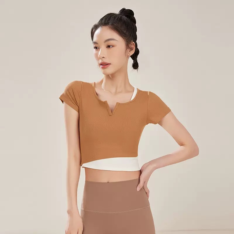 薄款运动上衣女短袖夏季撞色假两件修身短版健身跑步瑜伽服T恤