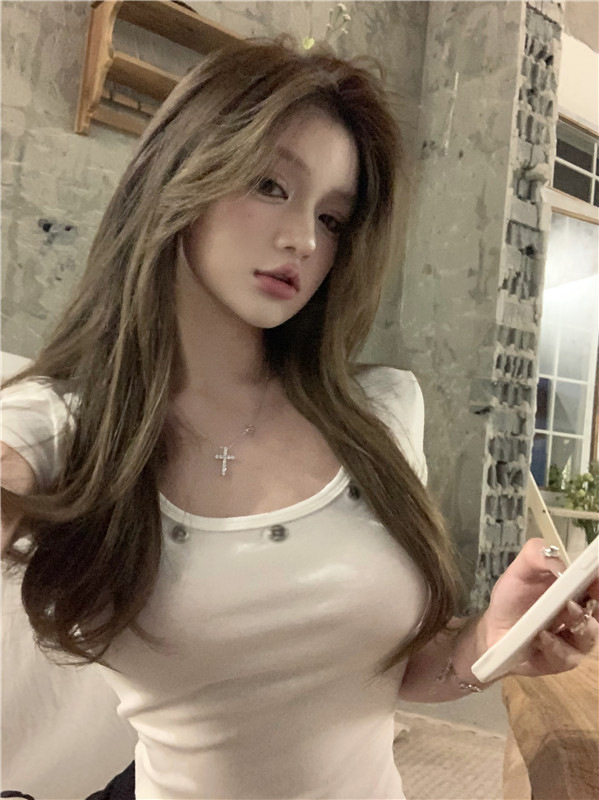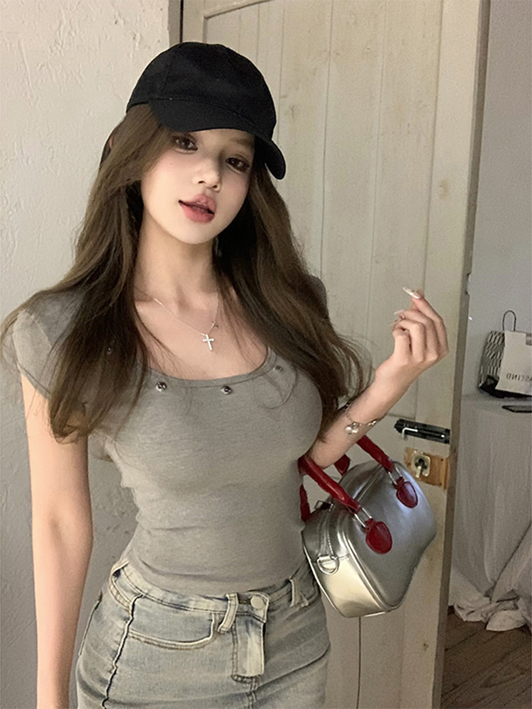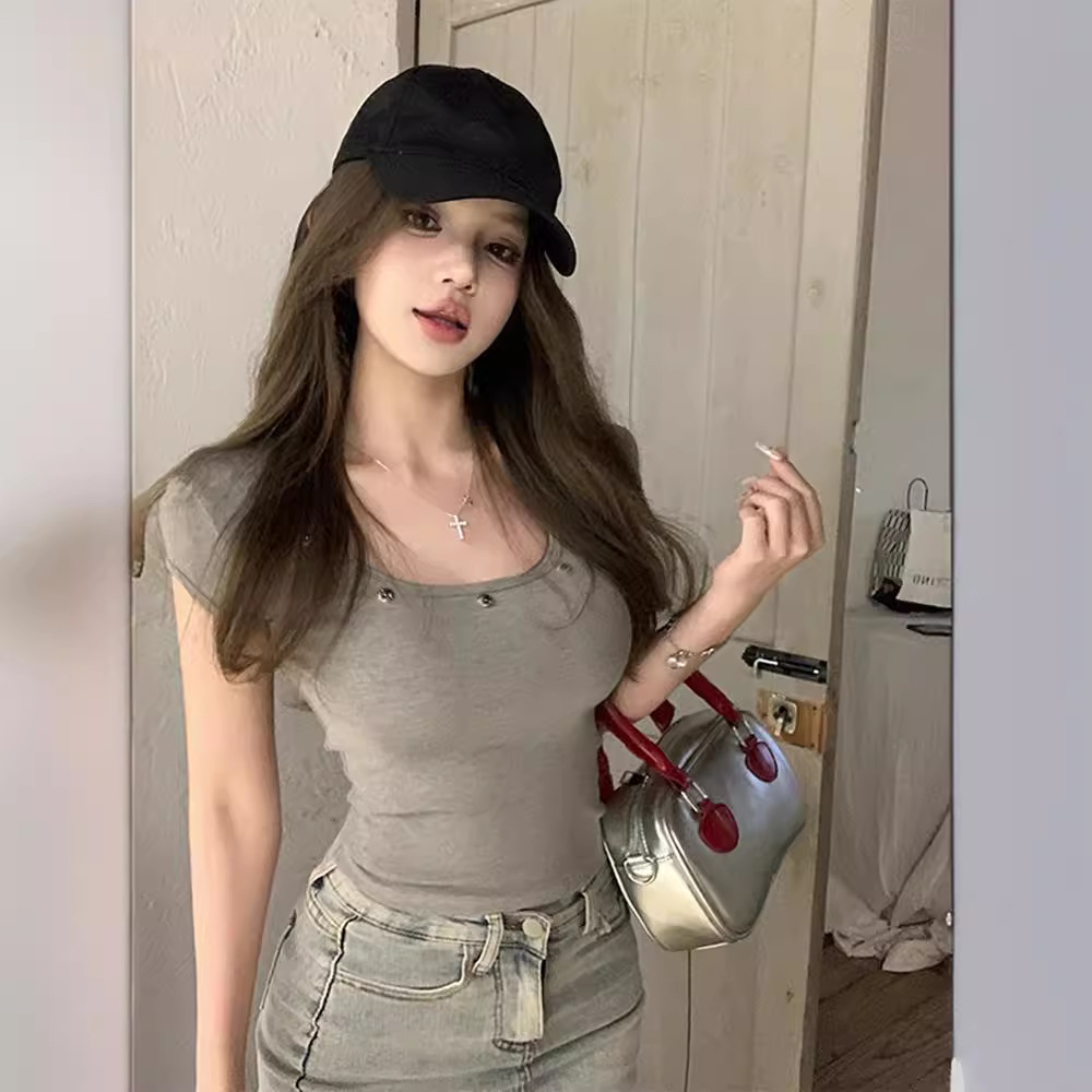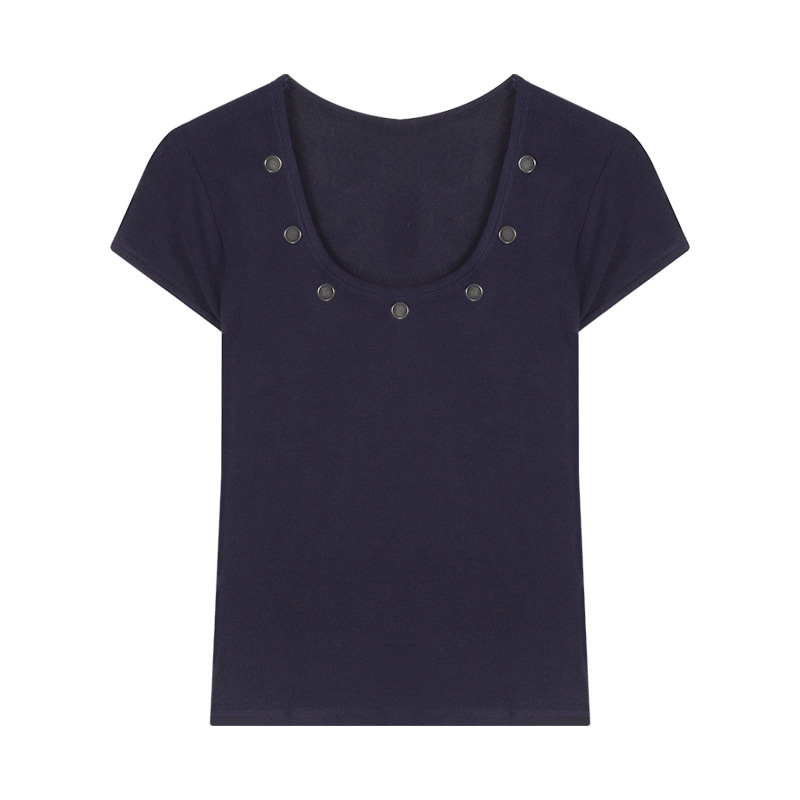 蓝色纽扣装饰u领短袖正肩T恤女夏季设计感基础款辣妹紧身短款上衣