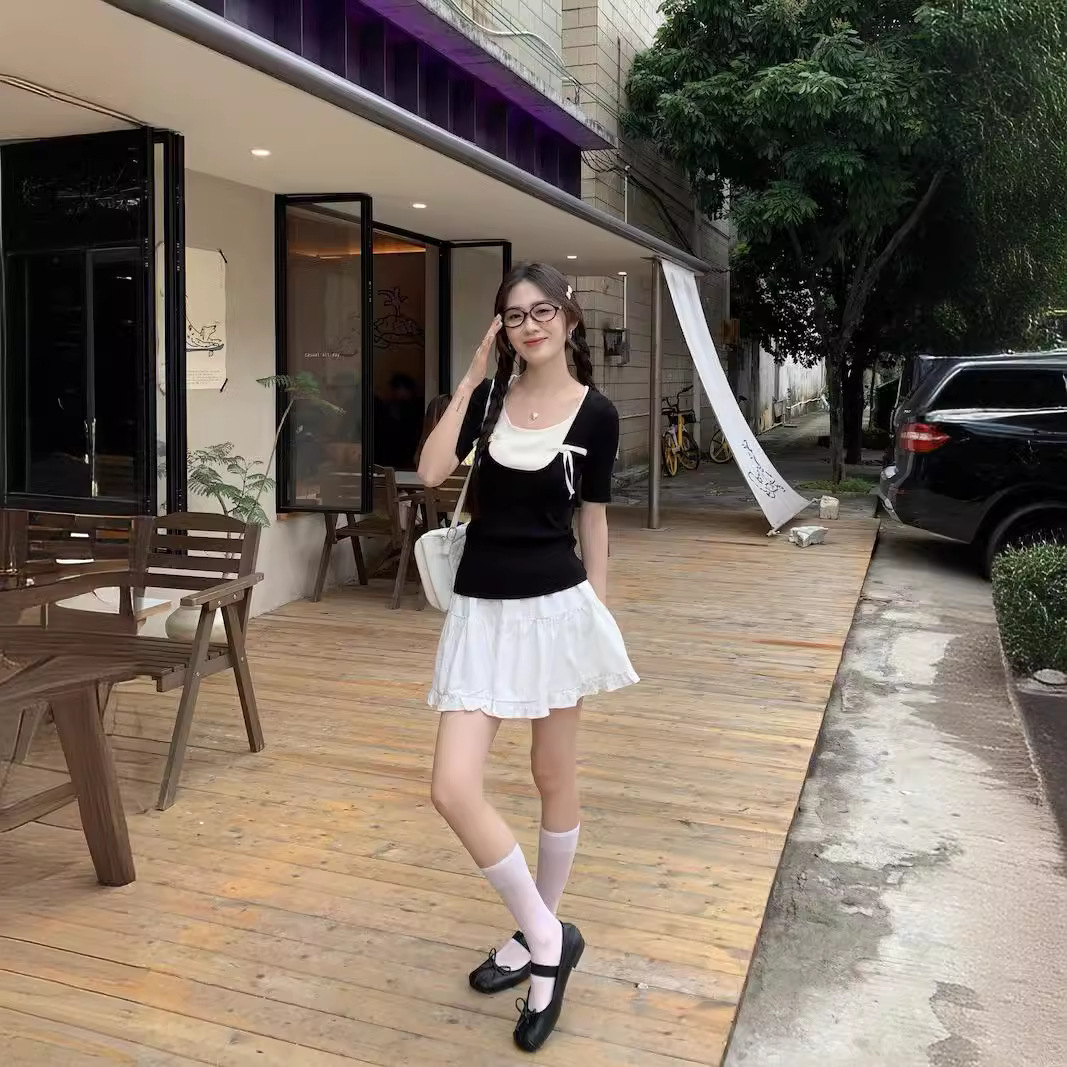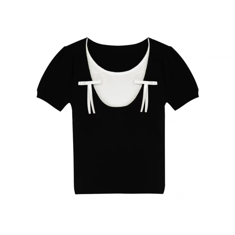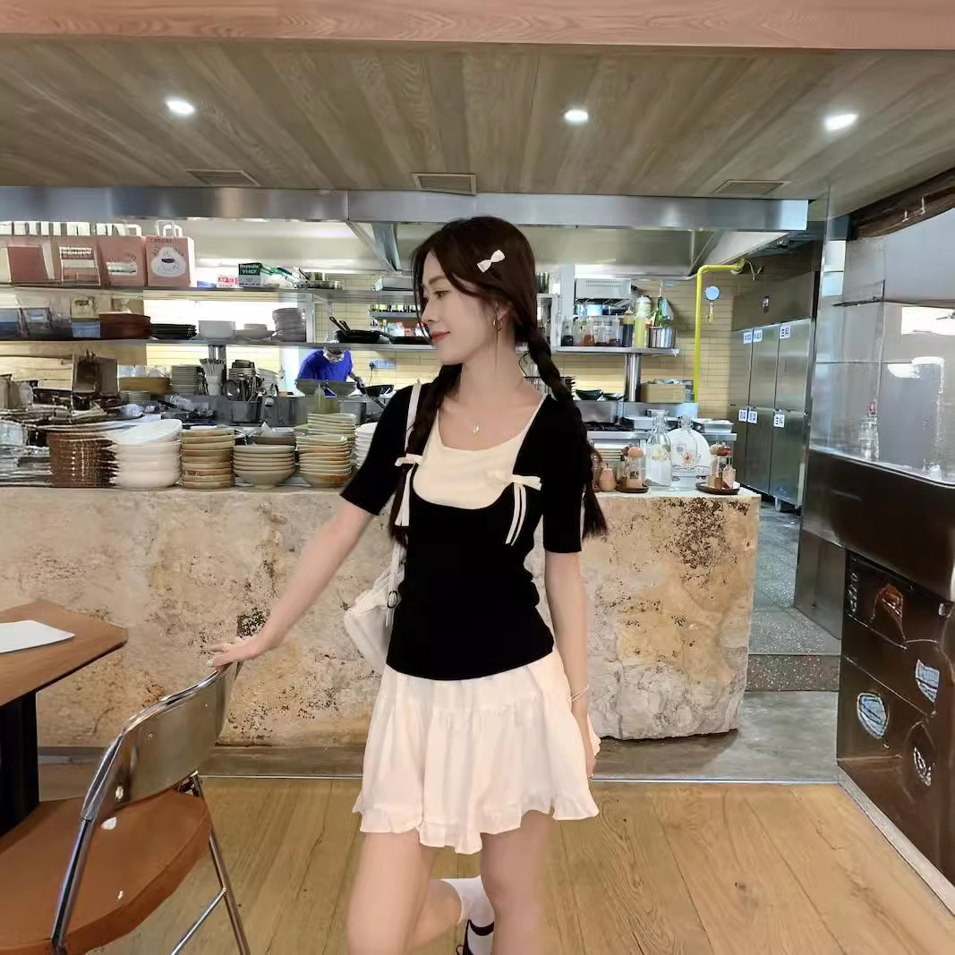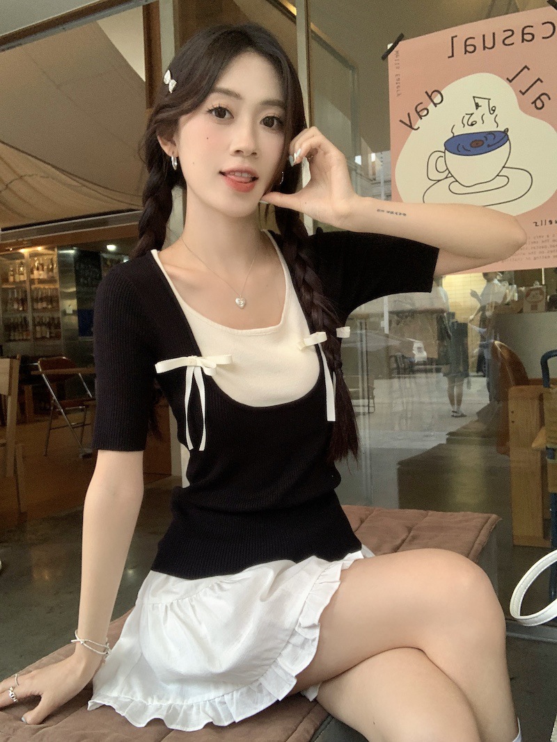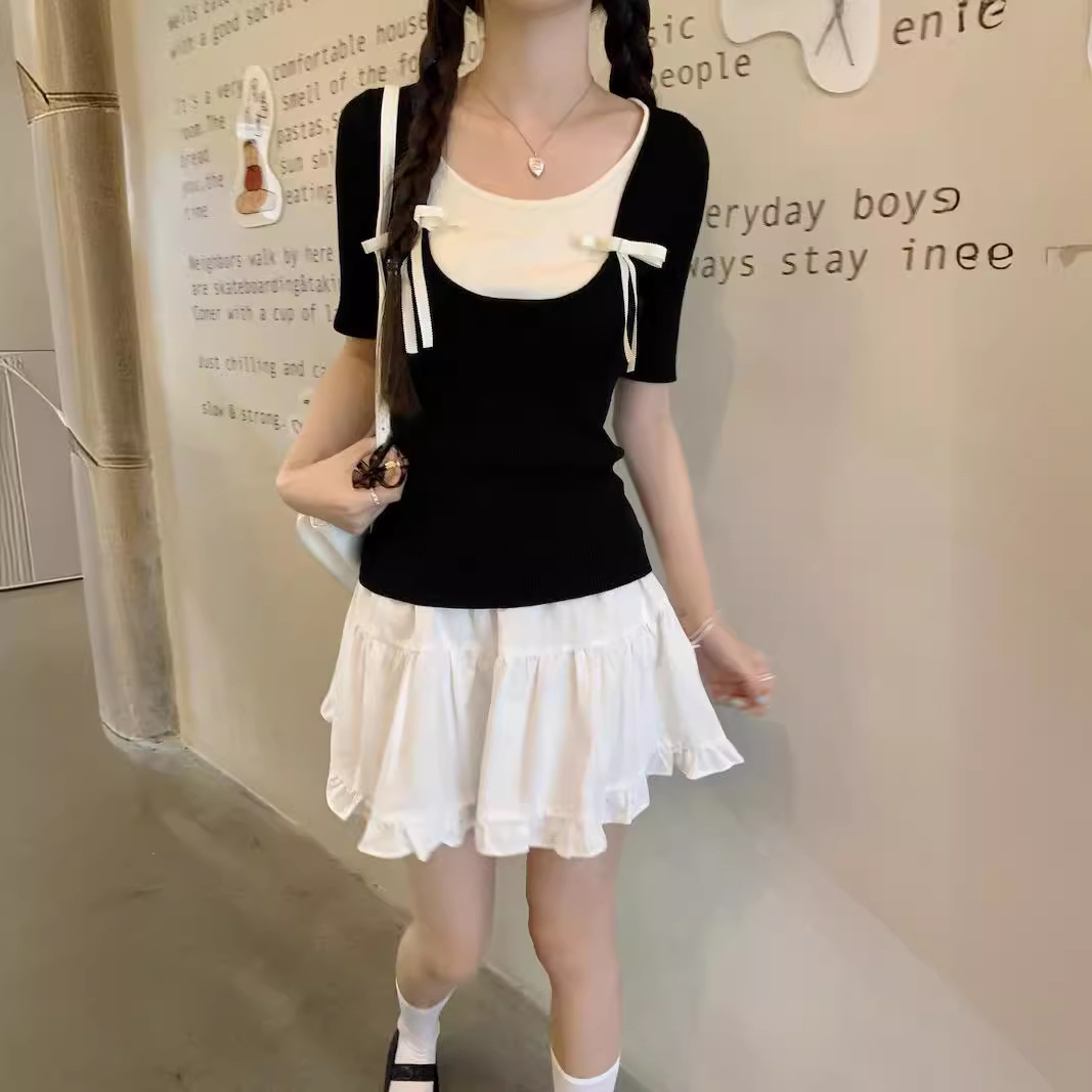 法式芭蕾风蝴蝶结针织短袖t恤女夏季小个子假两件撞色甜辣妹上衣