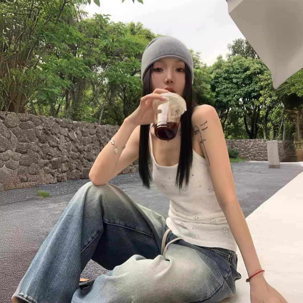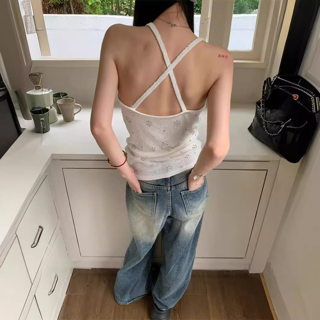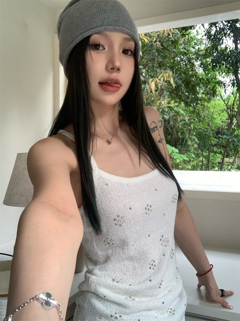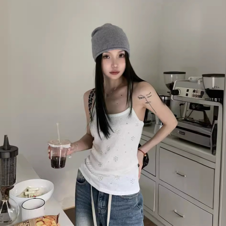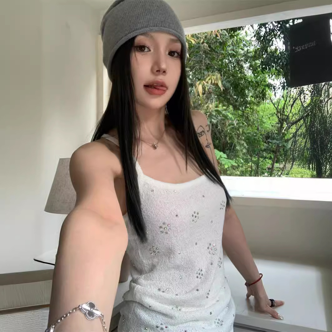 白色烫钻修身针织小吊带女夏季显瘦内搭辣妹无袖背心露背上衣外穿