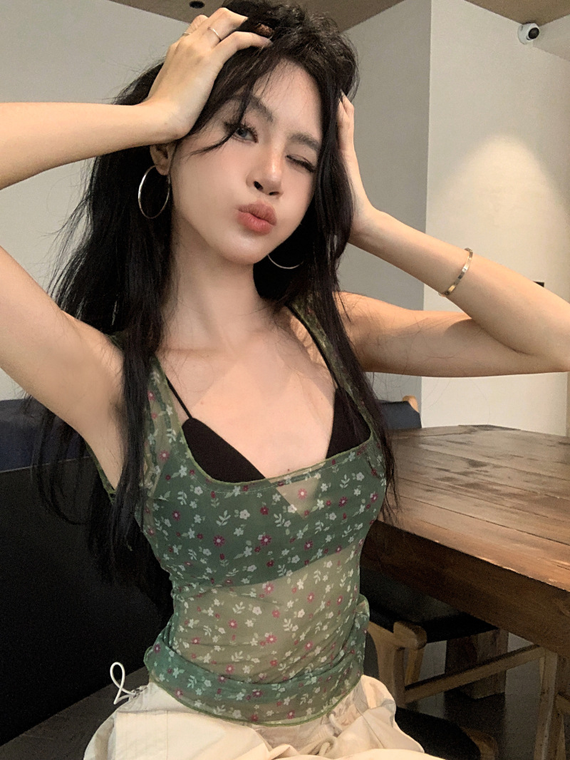 绿色网纱碎花叠穿吊带小背心女夏季修身薄款透视辣妹露背上衣外穿