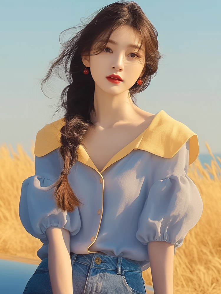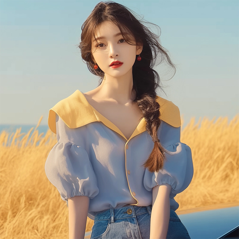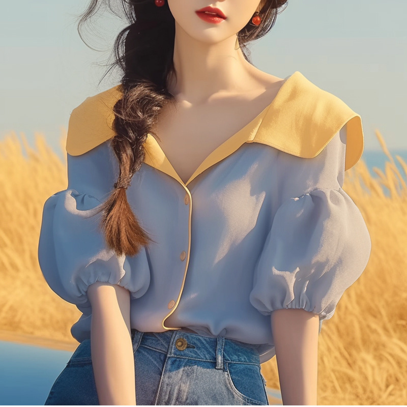 今年流行小众设计感上衣独特漂亮韩系别致撞色泡泡袖翻领衬衫女夏