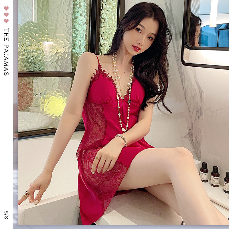 性感镂空蕾丝侧边低胸缎面雪纺睡裙夏季清凉舒适带胸垫家居服吊裙