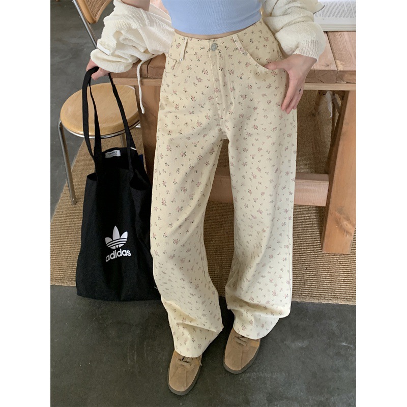 森系甜美碎花 宽松 直筒阔腿拖地裤 牛仔长裤