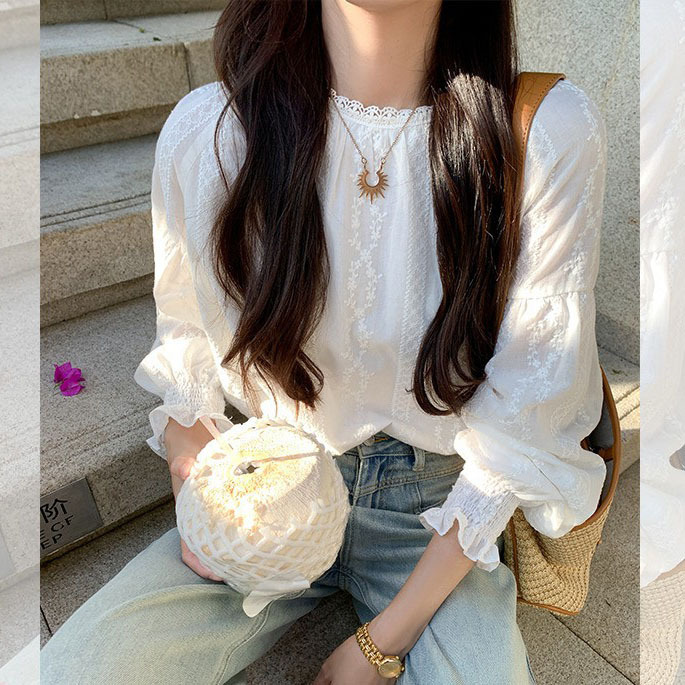 曾小咸洋气刺绣蕾丝白色衬衫女2025春时髦气质设计感宽松套头上衣