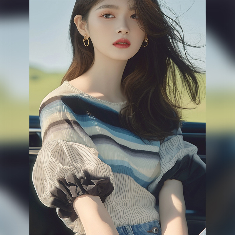 撞色泡泡袖上衣