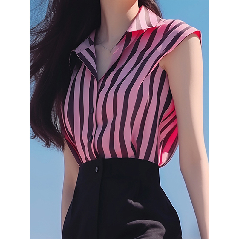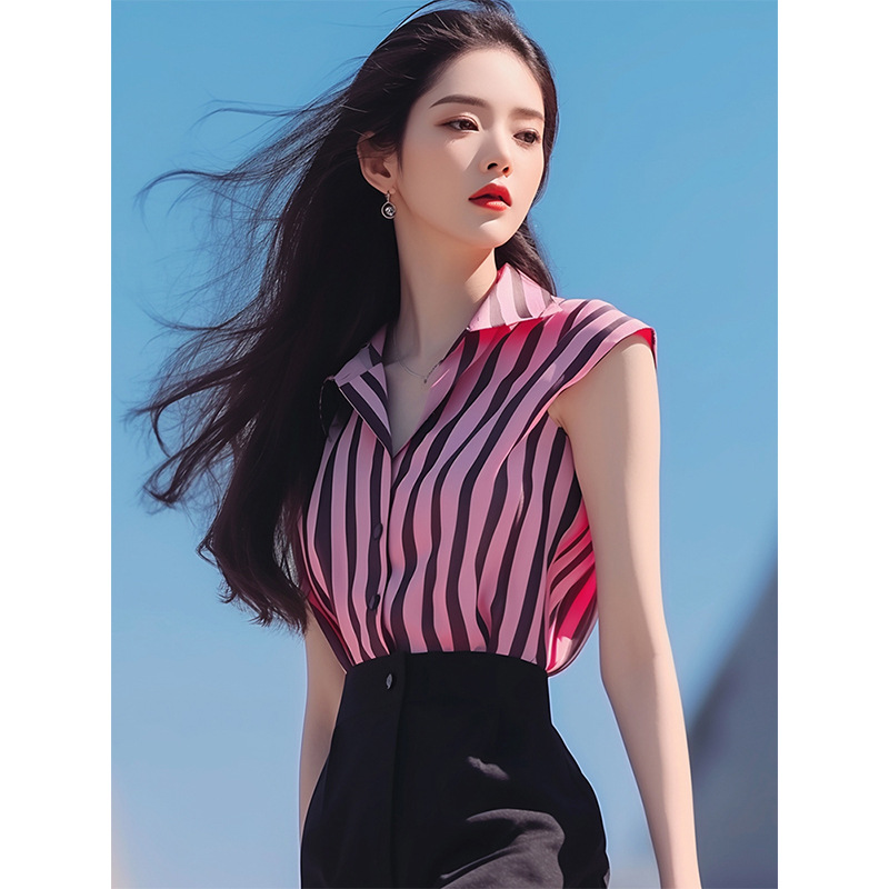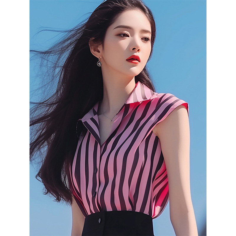 夏装女年新款粉色条纹短袖衬衫又甜又辣洋气独特别致绝美上衣