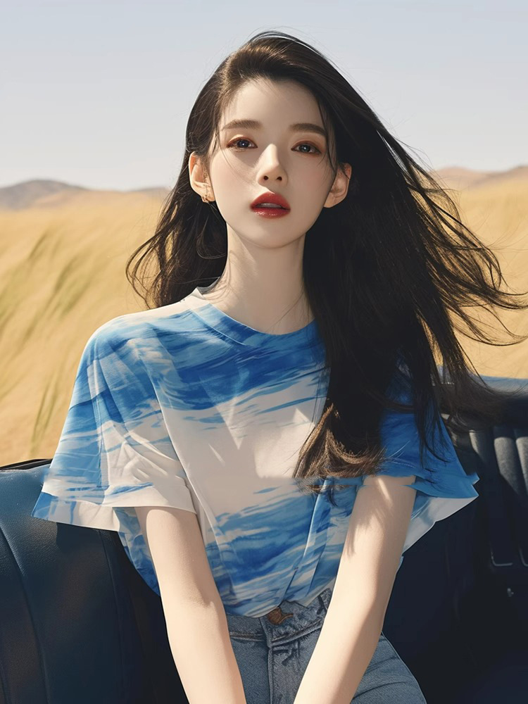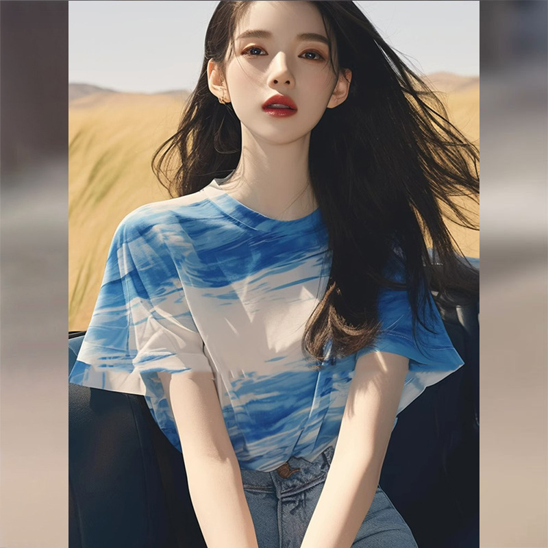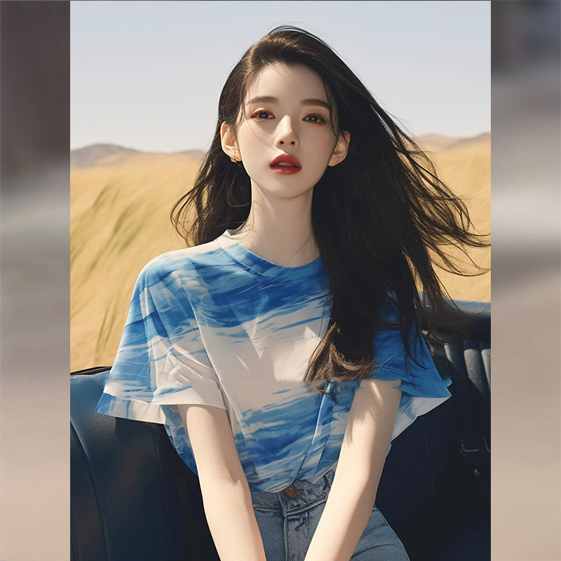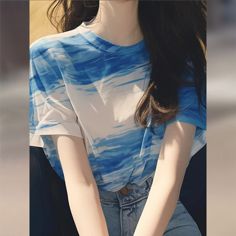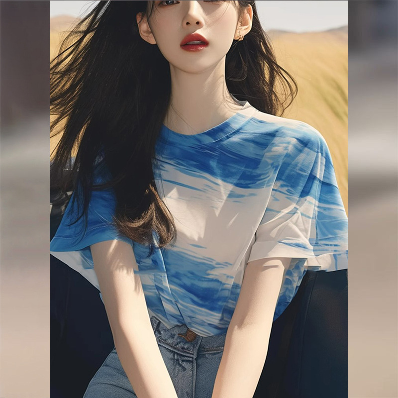 蓝色晕染冰丝短袖t恤女年新款夏季时尚洋气独特别致圆领上衣