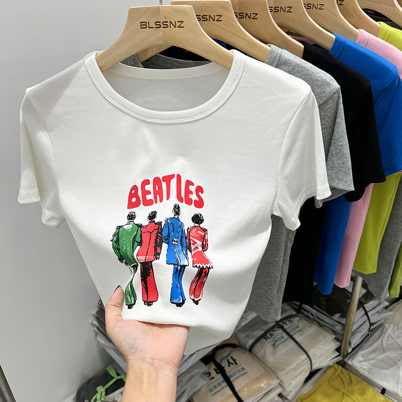 欧货螺纹短袖t恤女修身夏季新款时尚印花美式上衣半袖体恤潮