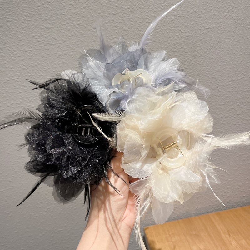 气质高级感仙气珍珠羽毛大号抓夹女后脑勺盘发鲨鱼夹百搭毛毛发夹