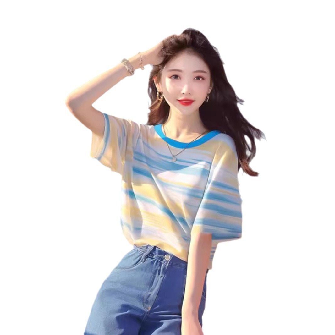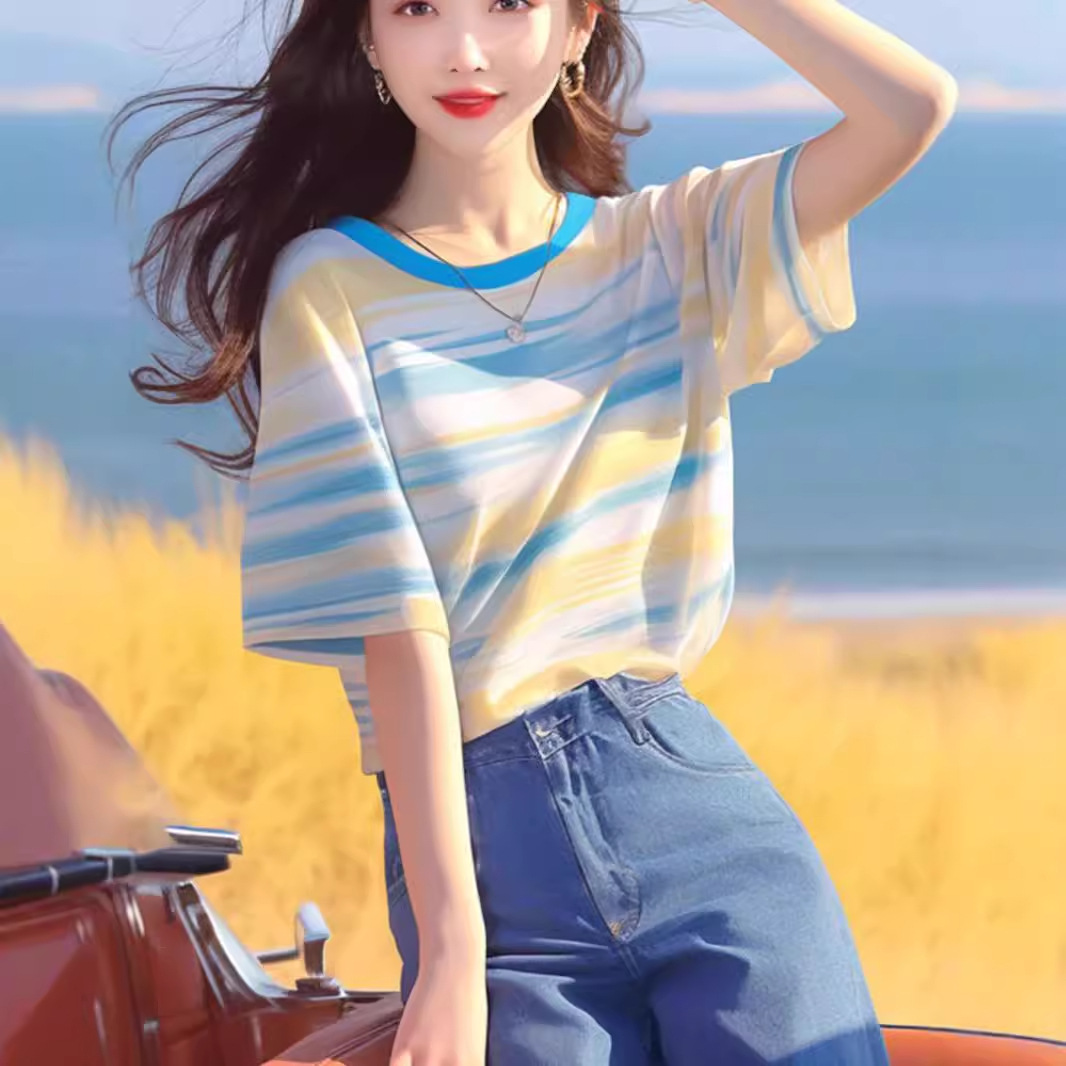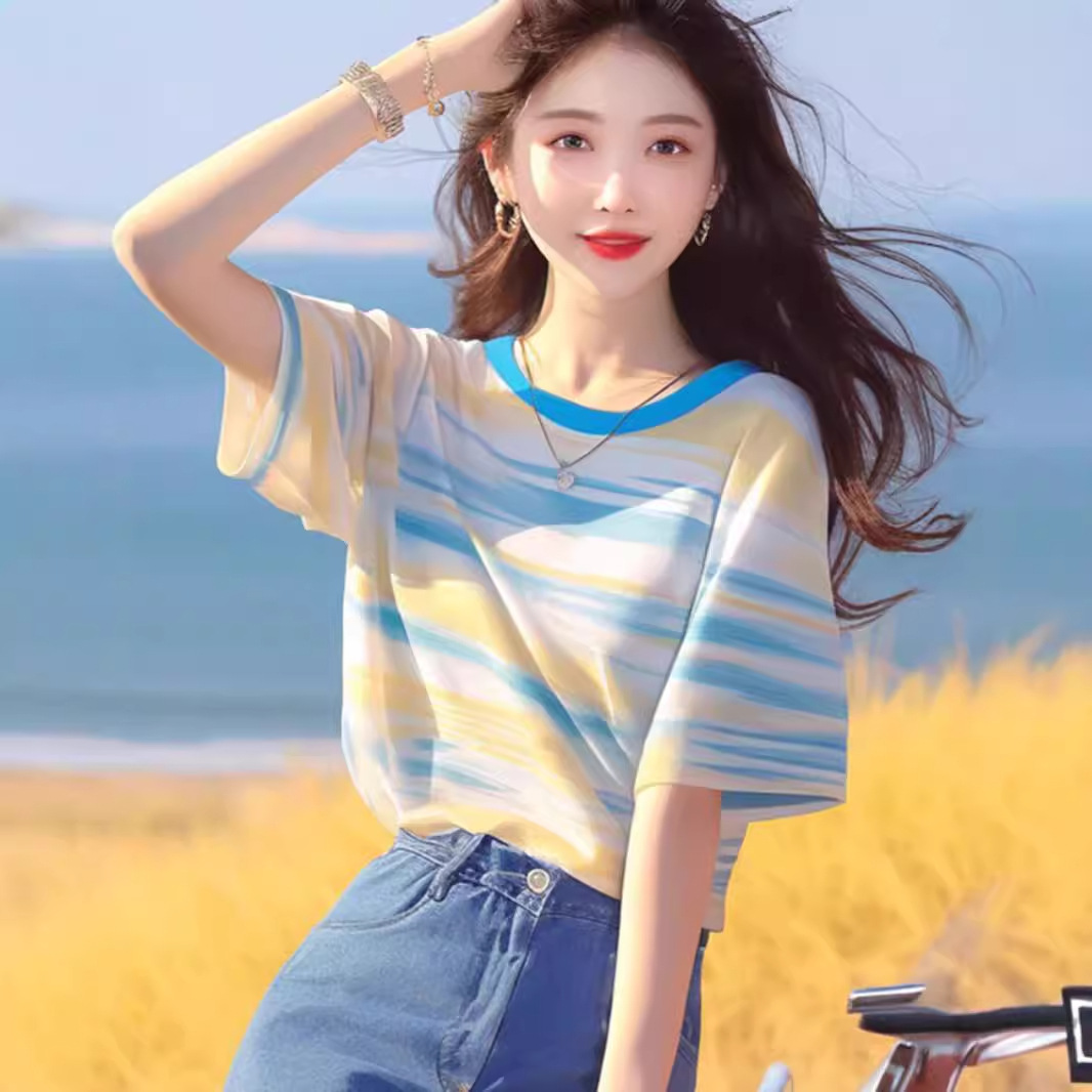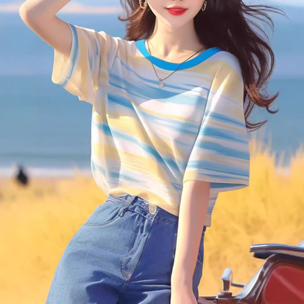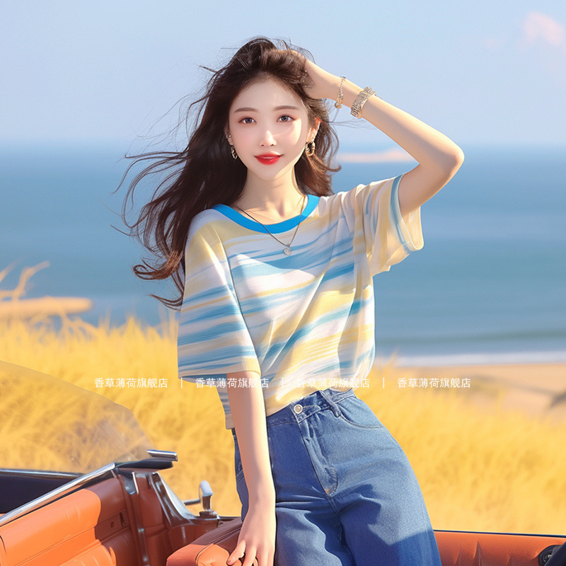 韩系chic洋气独特超好看上衣别致绝美百搭蓝黄条纹短袖t恤女夏季